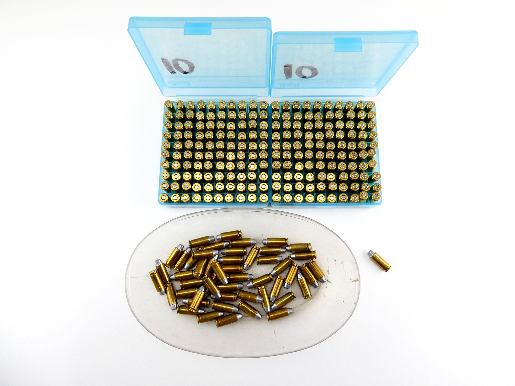 LOT INCLUDES; APPROX. (250) RNDS, (2) J&J PLASTIC AMMO BOXES FOR .45 ACP / 10MM.