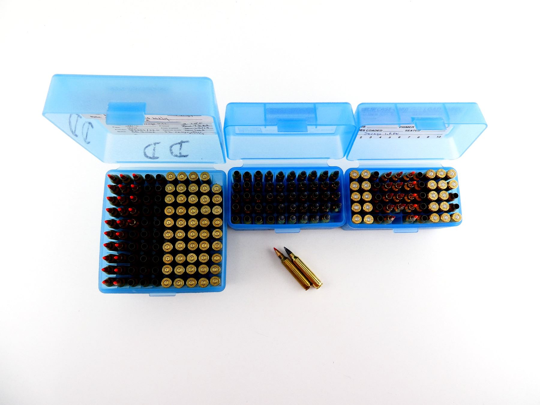 LOT INCLUDES; APPROX. (73) RNDS, CONSIGNOR STATES; "40 GRNS HORNADY V-MAX MOLY, 40 GRNS HORNADY V-MAX, 40 GRNS NOSLER, ETC.,", NOT CONFIRMED, (77) NON-PRIMED BRASS CASES, (2) CASE-GARD 50 PLASTIC AMMO BOX, (1) CASE-GARD 100 PLASTIC AMMO BOX.