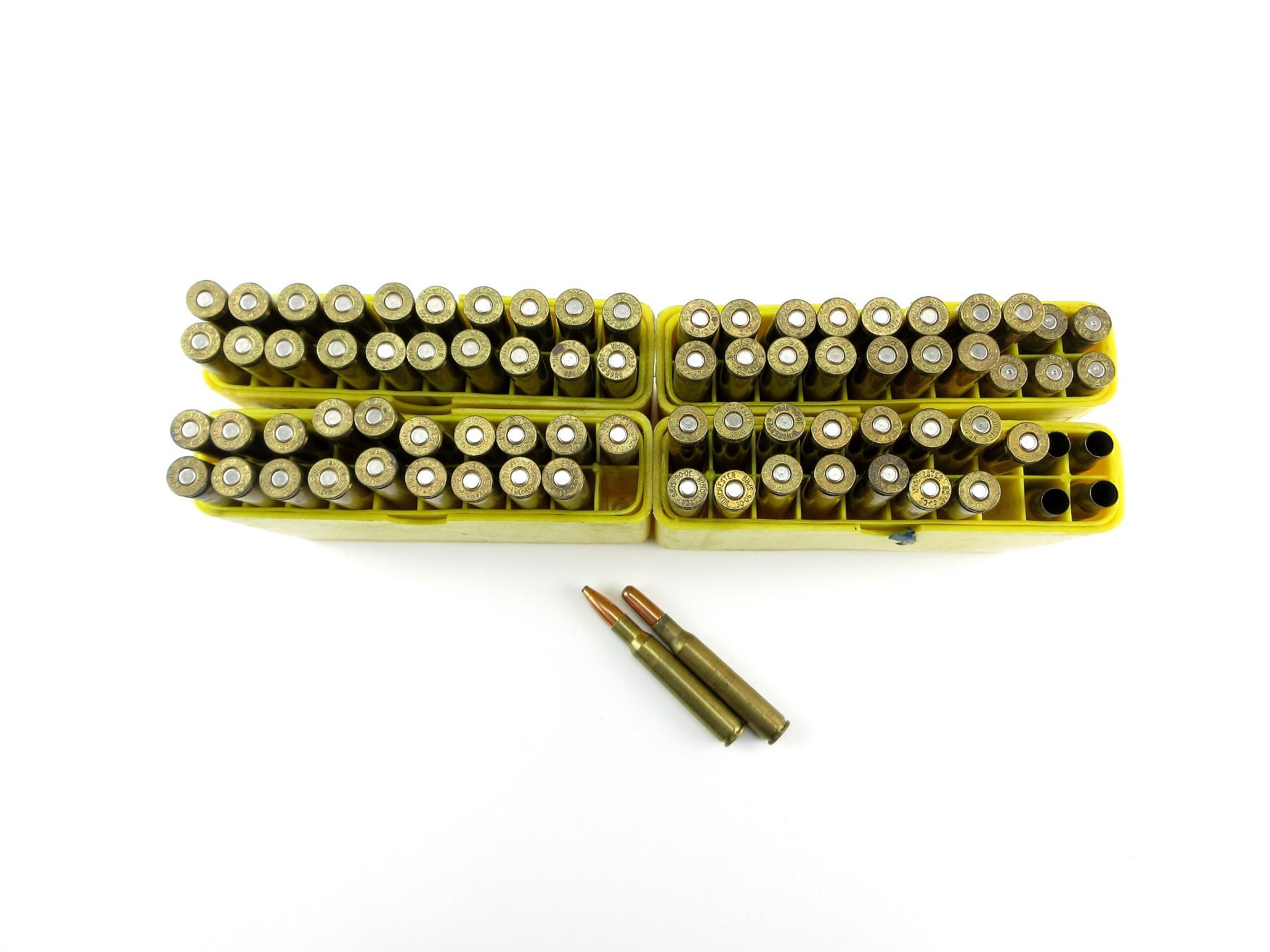 LOT INCLUDES; APPROX. (71) RNDS, (9) NON-PRIMED BRASS CASES, (4) DICKSON PLASTIC LARGE RIFLE AMMO BOX.