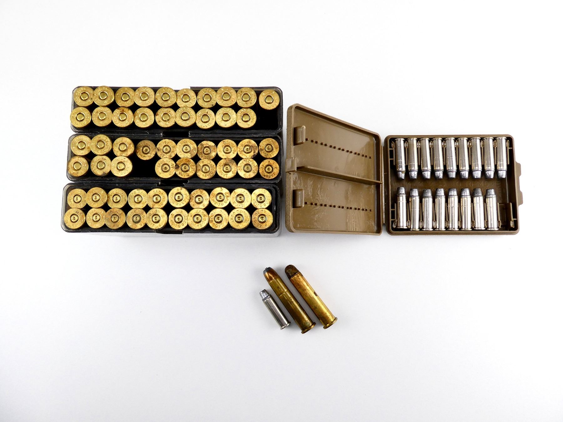 LOT INCLUDES; APPROX. (45) RNDS, (33) NON-PRIMED BRASS CASES, (3) MTM PLASTIC LARGE RIFLE AMMO BOXES, (1) MTM CASE-GARD 18 PLASTIC AMMO BOX.