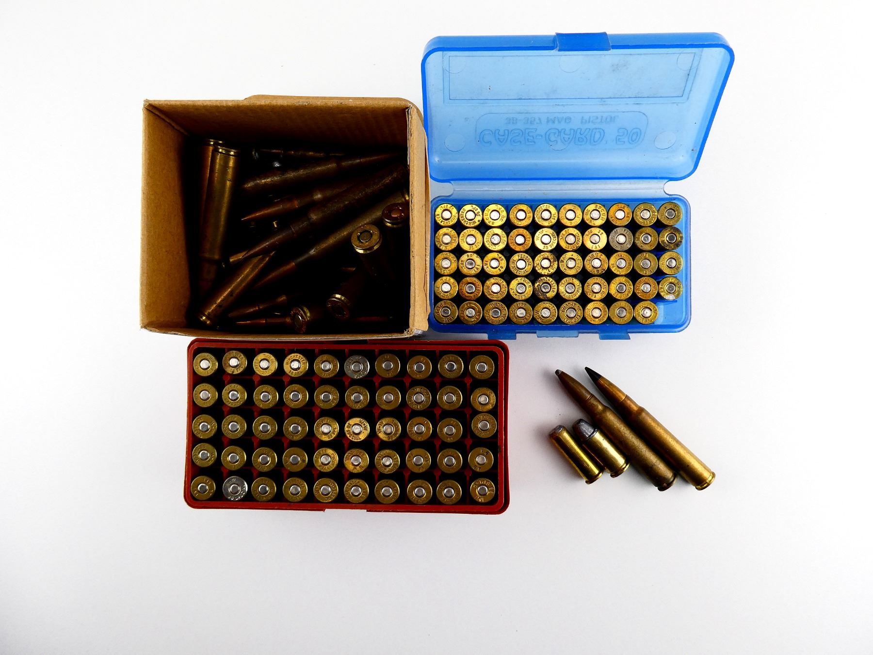 LOT INCLUDES; APPROX. (171 RNDS, VARIOUS CALIBERS INCLUDING; .38 SPL, .45 AUTO, .244 REM, .223 REM, ETC., CONTAINS SOME MILITARY RNDS, (2) PLASTIC AMMO BOXES.