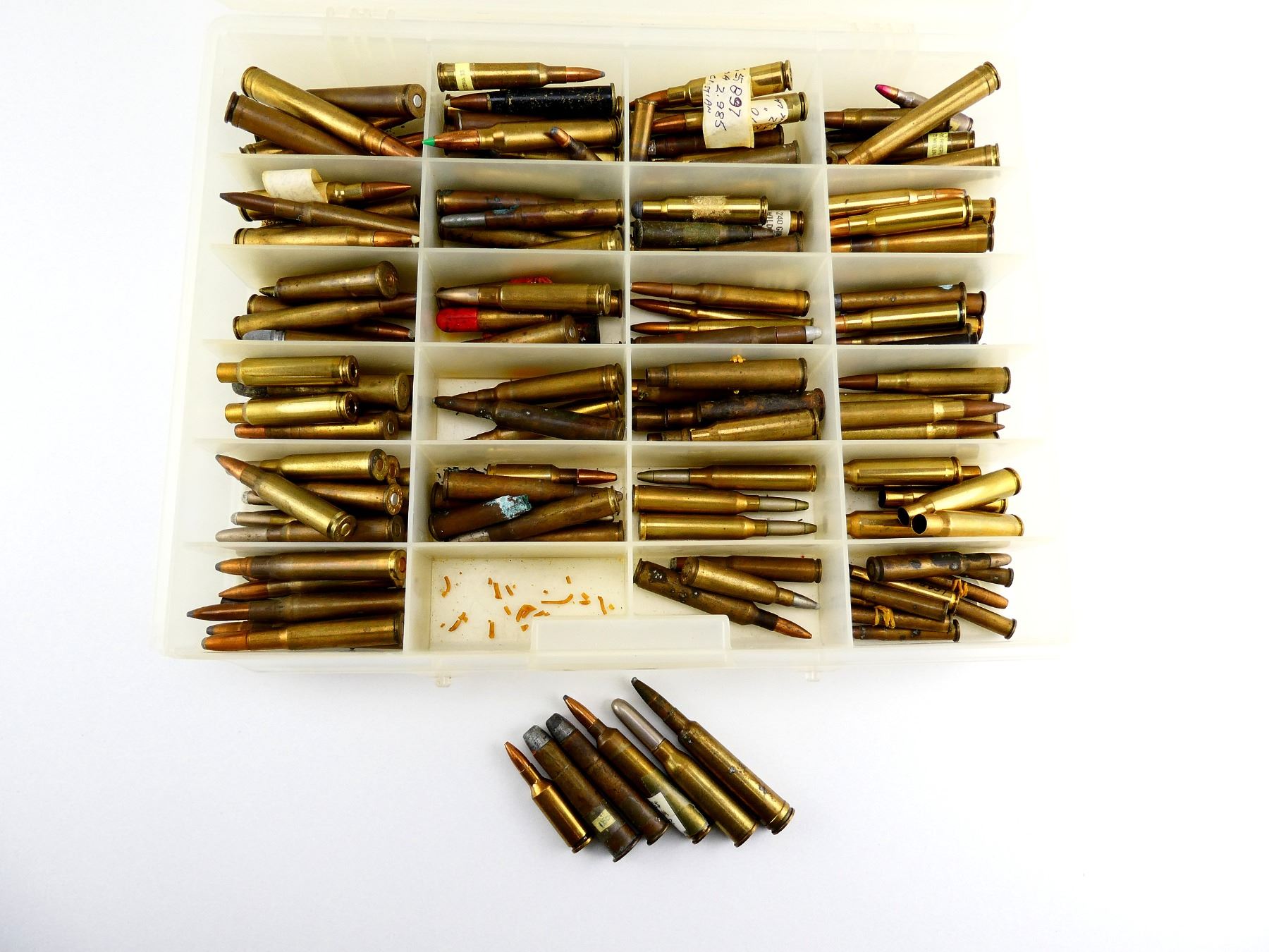 LOT INCLUDES; APPROX. (105) RNDS, VARIOUS CALIBERS INCLUDING; .22 PPC, .40-65, .38-55 WIN, .275 H&H MAGNUM, .240 GIBBS WILDCAT MADE FRON .25-06 REM , 8X50R, ETC., (2) PRIMED BRASS CASES, (14) NON-PRIMED BRASS CASES, (24) DUMMY RNDS, (3) RNDS HAVE BEEN STRUCK, (1) RND IS BROKEN, SOME CORROSION, MAY CONTIN SOME FACTORY RNDS, (1) PLASTIC STORAGE BOX, APPROX OAL 14"X11"X2 1/4". SEE PHOTOS.