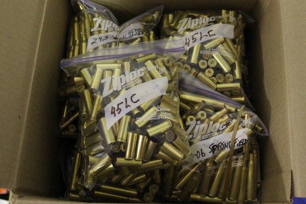 BOX OF BRASS: INCLUDES BRASS FOR: 45 LC, 243 WIN, 30-06, 45-70, AND LOTS MORE