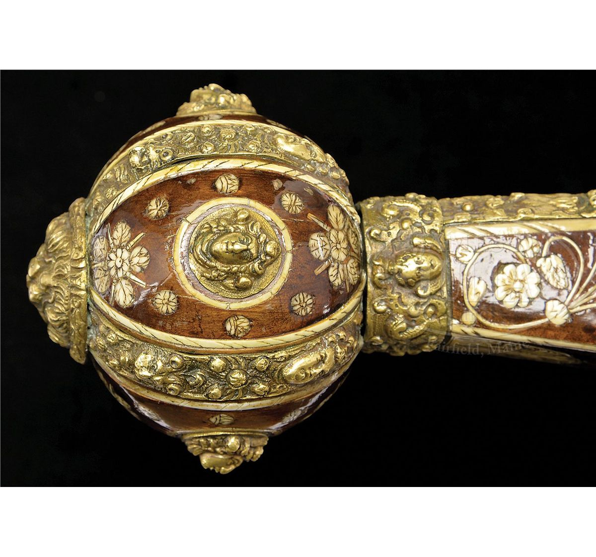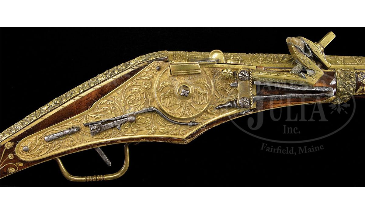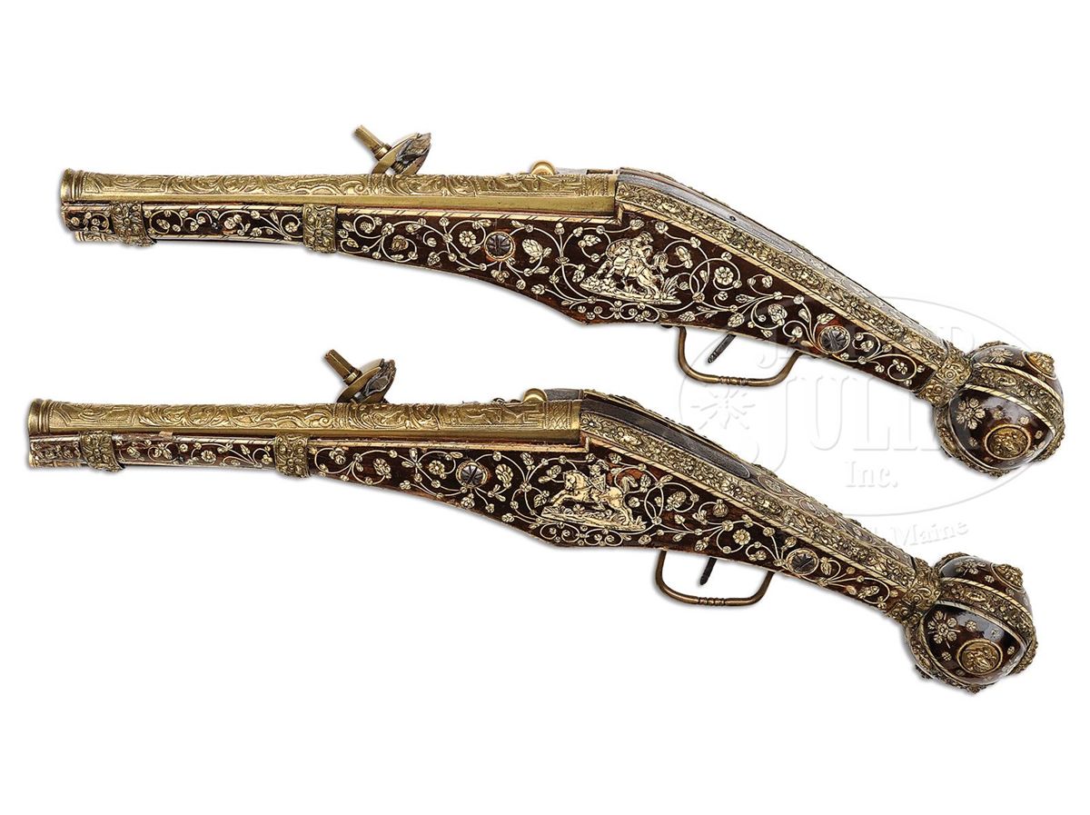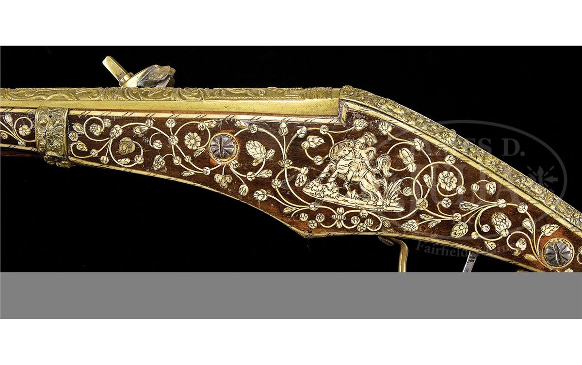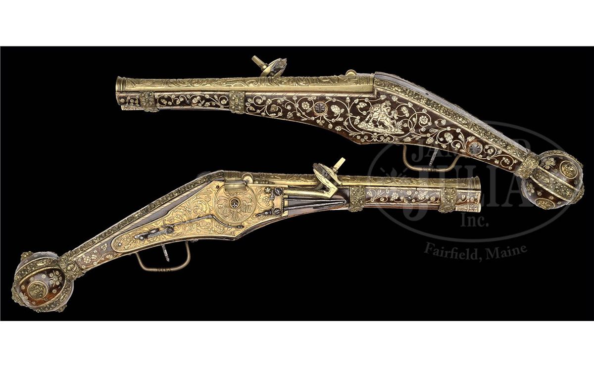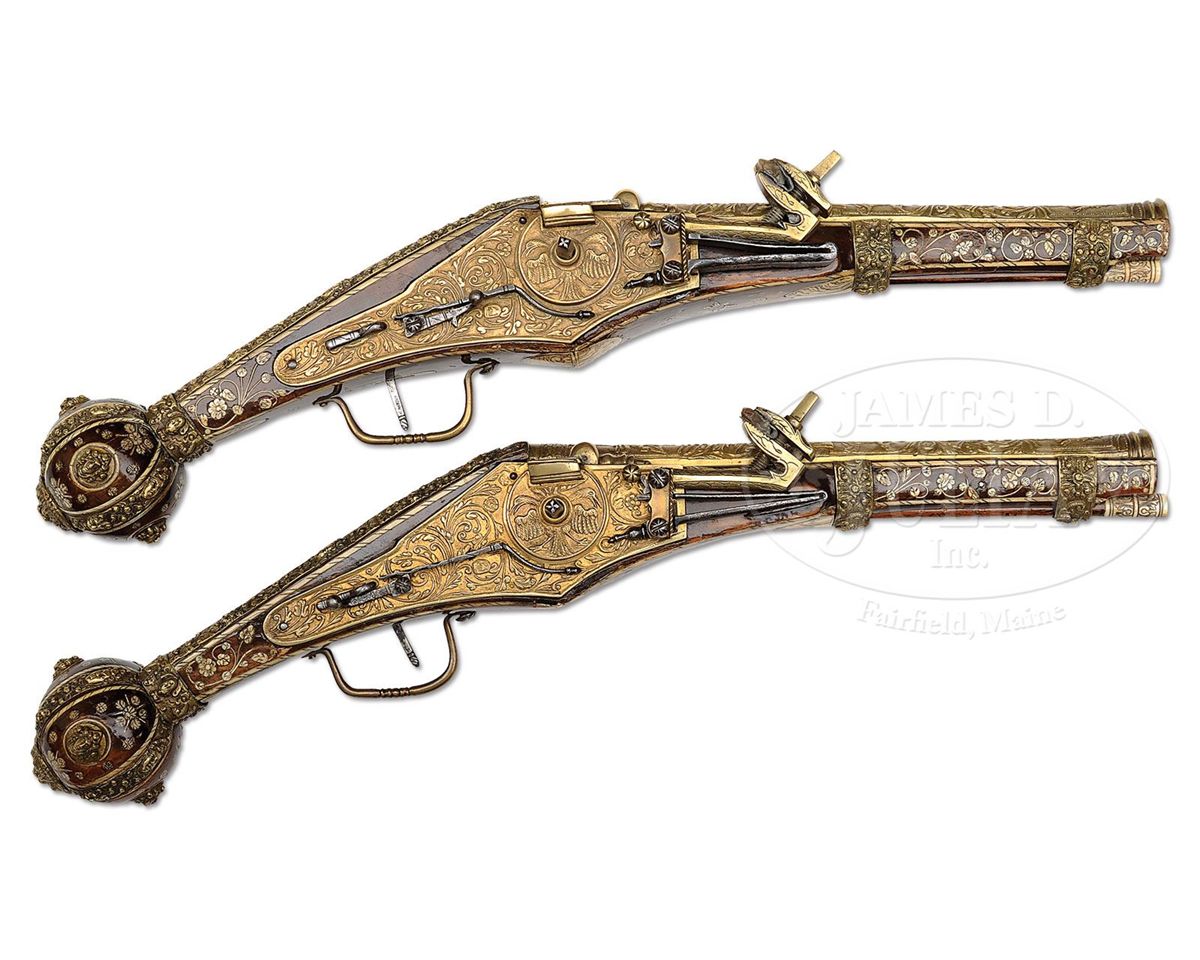 NSN. Pistols with waisted bbls, cast and chased overall with figures of Diana, a warrior and foliage inhabited by birds. Locks are overlaid with gilt bronze plates, cast and chased with foliage. Enclosed wheel cover is chased and cast with the double headed eagle of Austria. Dogs of brass and fruitwood full stocks inlaid with engraved stag horn plaques, foliate scrolls and a mounted warrior. Ball butts inlaid with gilt bronze strapwork cast and chased with masks and floral motifs. NOTES: These remarkably attractive wheel lock pistols incorporate elements from various periods, which precludes assigning a specific date to their manufacture. PROVENANCE: See Auction Catalog, Sotheby's Monaco, 12/7/87, Lot 77, Plate 26. Collection of Charles Draeger, sold Sotheby's Monaco, December 7, 1987. Collection of Dr. Douglas Sirkin. CONDITION: Dogs, pans and trigger guards are of later date. One dog spring with old repair. 4-49842