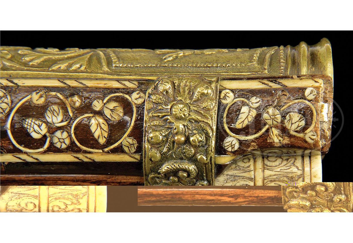 REMARKABLE PAIR OF WHEEL LOCK PISTOLS IN THE 16th CENTURY SAXON STYLE WITH GILT BRONZE LOCKS, MOUNTS