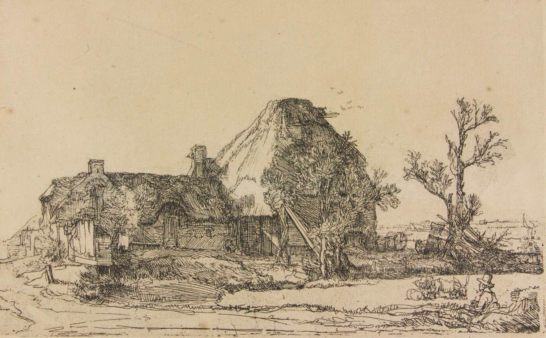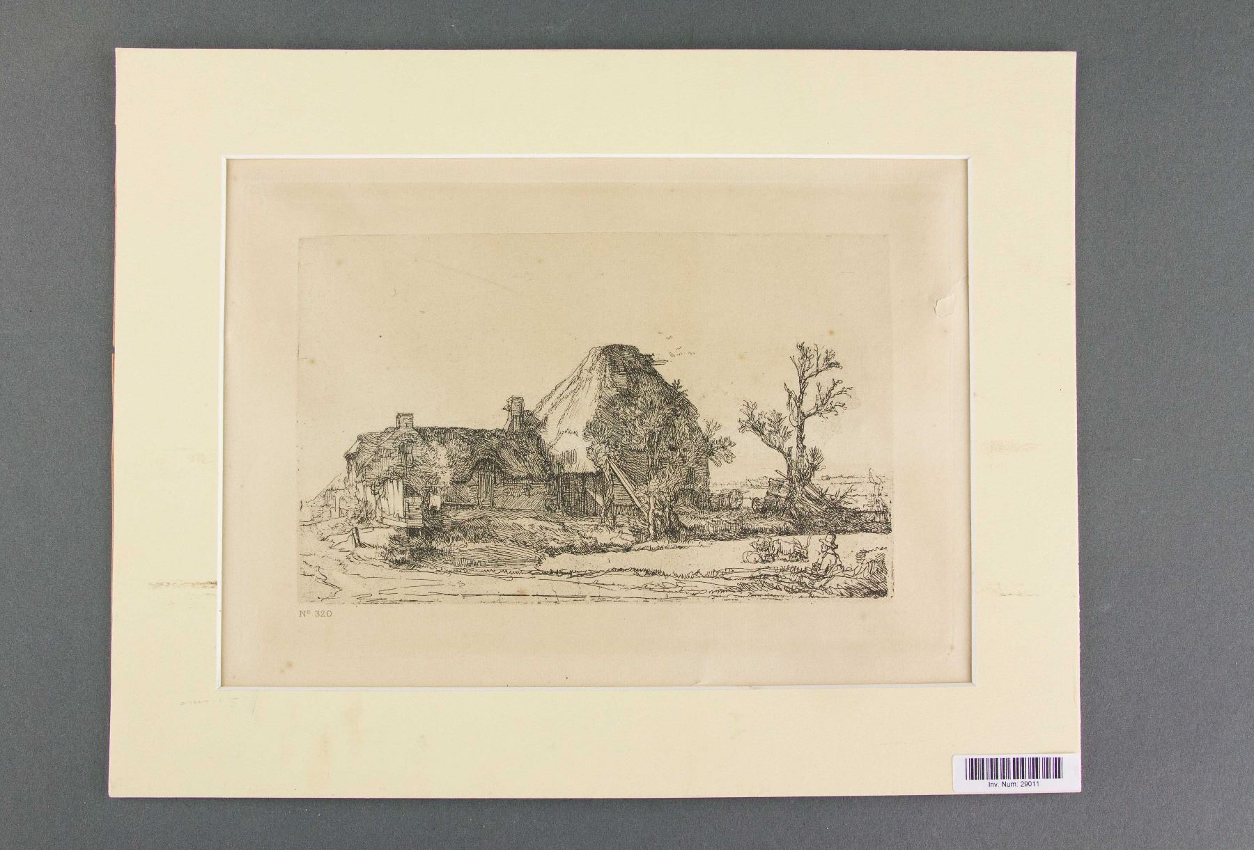 Litho on paper, mounted on board and originally drawn by Rembrandt Harmenszoon van Rijn (1606-1669). Landscape with craftsman. Numbered #320; 12.5 x 20 cm