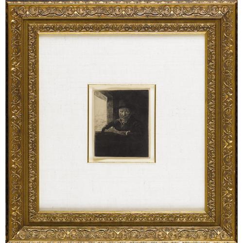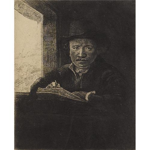 <B>REMBRANDT VAN RIJN</B></I> (Dutch 1606-1669)<BR><I>Rembrandt Drawing At A Window,</B></I> 1648<BR>Etching<BR>6-1/4 x 5-1/8 inches, plate (15.9 x 13 cm)<BR>Signed and dated in the plate<BR>From the: <I>Recueil de Quatre-Vingt-Cinq Estampes Originales</B></I><BR>Printed by: <I>H.L. Basan,</B></I> 1807-1808<BR><BR>Provenance:<BR>Park West Galleries (Southfield, Michigan);<BR>Private collection (Michigan)<BR><BR> <B>Condition Report:</B> Beautifully framed and matted, no condition issues<BR><BR><b>Shipping:</b> Requires 3rd Party Shipping (<a target="_blank" href="http://www.heritageauctions.com/common/shipping.php">view shipping information</a>)