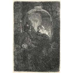 Der Schulmeister.  Radierung 1641. B. 128. S. 128, II (von III). W.-B. 128. N.-U. 128, I (von III). - Mit dem Namenszug und Datum in der Platte. Wasserzeichen: Wappen von Amsterdam (vgl. Ash-Fletcher WM 1, H.a). Größe: 9,5 x 5,2 cm. Mit winzigem Rändchen. Klarer Abdruck vor den feinen vertikalen Kaltnadelstrichen auf der linken Schulter der Frau und weiteren Überarbeitungen.