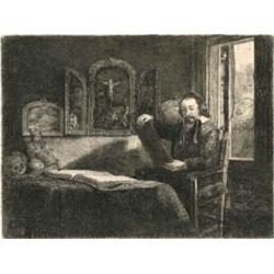 Abraham Francen, Apotheker und Kunstsammler. Radierung um 1657. B. 273. S. 273, X. W.-B. 273, X. N.-U. 273, VII (von IX). - Wasserzeichen: ? (nur schwach sichtbar). Größe: 15,7 x 20,9 cm. Bis zum Plattenrand beschnitten. Minimal stockfleckig, mit feiner Papierquetschfalte am linken Rand sowie vereinzelten winzigen Retuschen. Oberrand mit Papierstreifen hinterlegt. Kräftiger Abdruck von P. F. Basan.