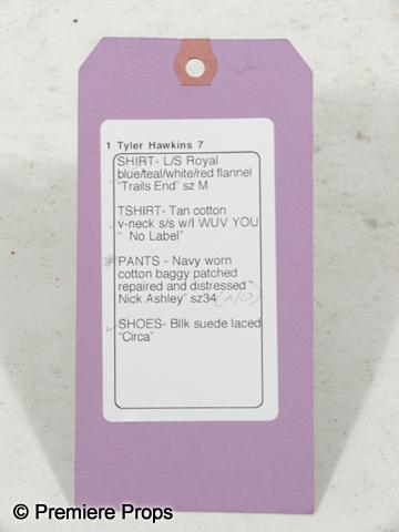 Remember Me (2010) - Tyler Hawkins (Robert Pattinson) screen worn long sleeve royal blue, teal, white, and red flannel 'Trails End' shirt, (size m) and tan cotton v-neck short sleeve with 'I Wuv You' t-shirt. (no size) Includes wardrobe tag.