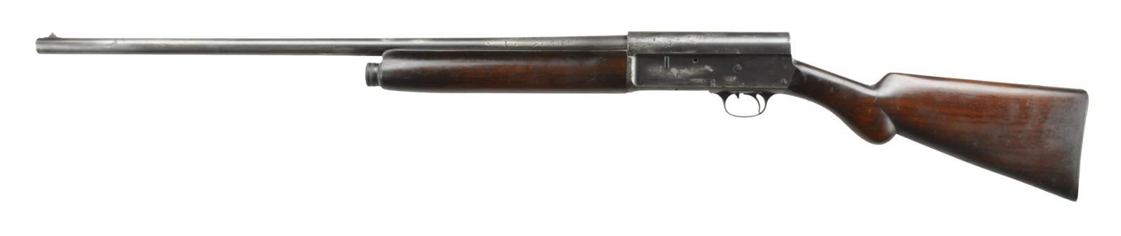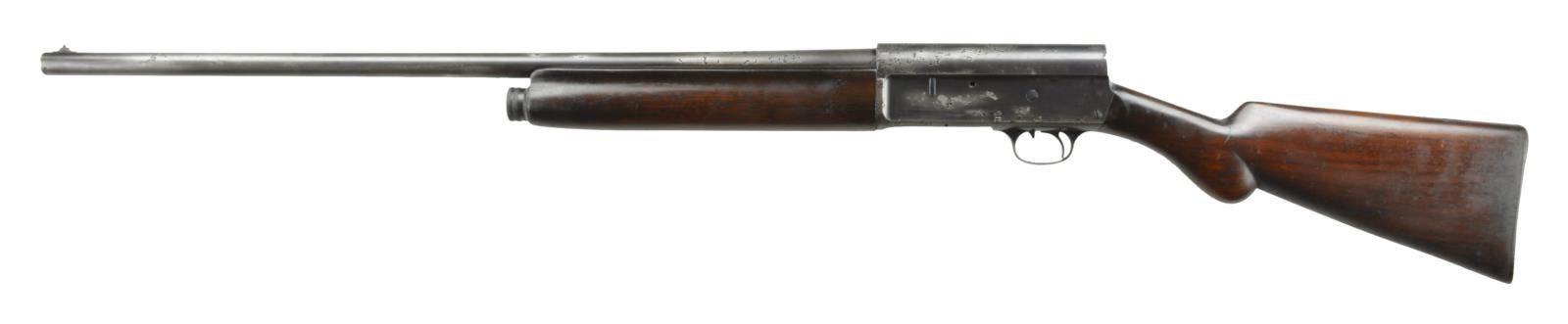 Cal. 12 Ga. S# 33916. Bbl. 28" plain w/ fixed FULL choke. Recoil operated action w/ safety in front of trigger guard. Blue finish. Finger groove walnut forearm & rnd. knob pistol grip stock w/ original buttplate. CONDITION: 50% dull fading blue w/ scattered spots of deep pitting on action & bbl. Wood has aged, darkened appearance showing scratches & marks. Functioning action w/ hardened grease. Good bright bore. (22-1228/DS). CURIO. $150-200.