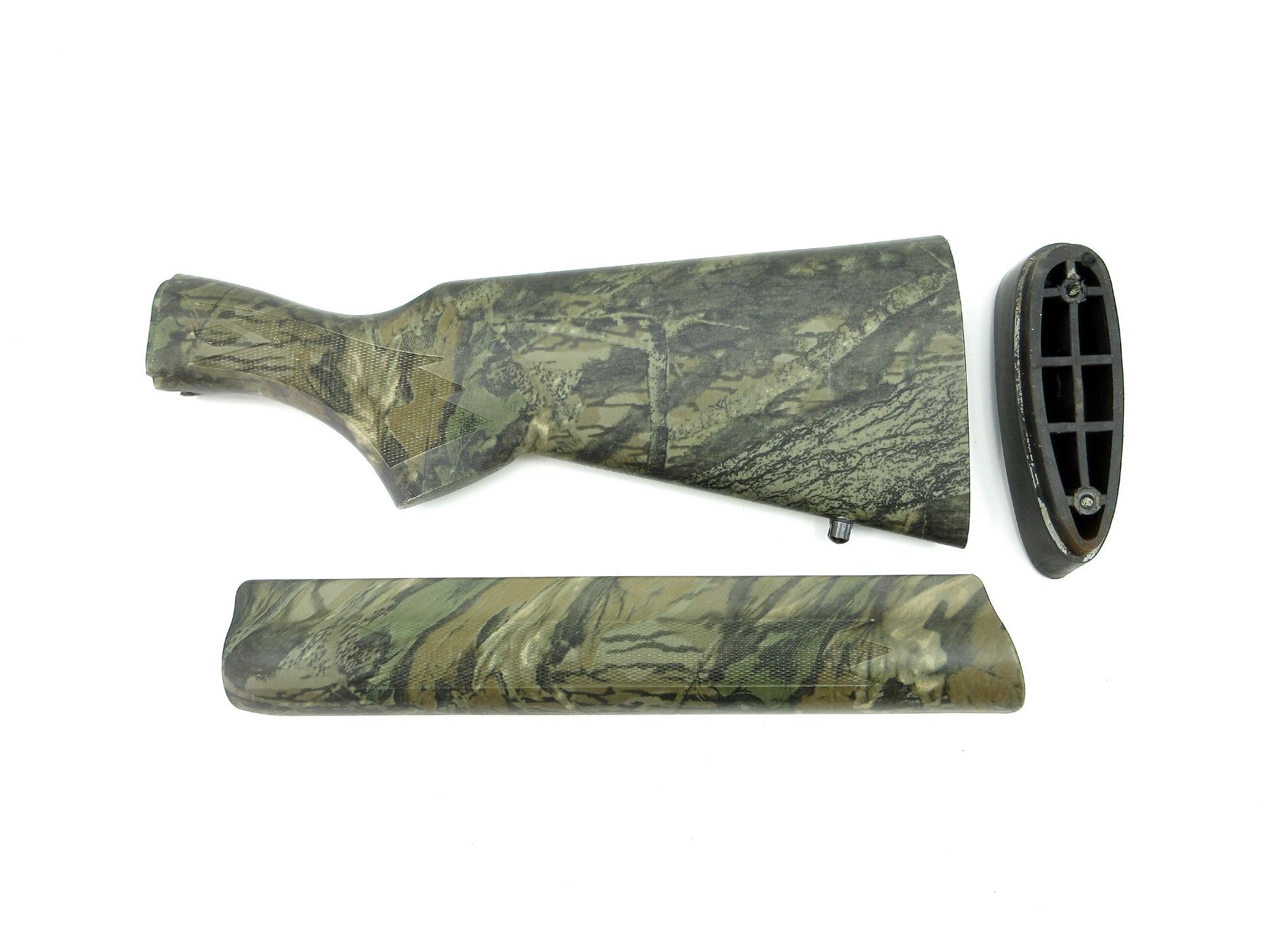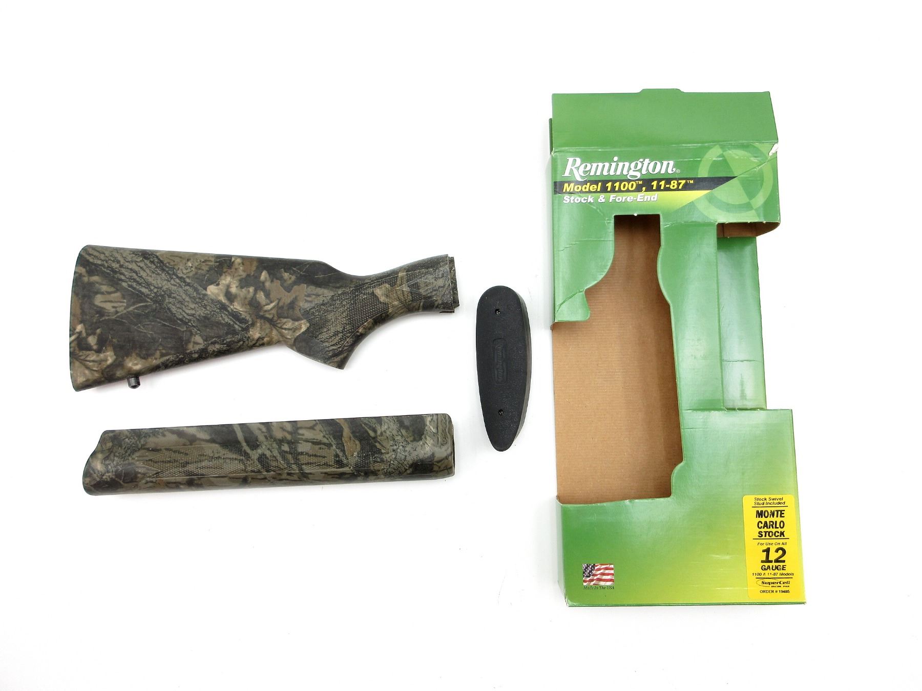 LOT INCLUDES; (1) BUTT STOCK, CAMO POLYMER CONSTRUCTION, CHECKERED GRIP, WITH SWIVEL STUD, OAL APPROX. 13 1/8", WITH ORIGINAL PACKAGING, MAY REQUIRE FITTING, (1) FOREND, CAMO POLYMER CONSTRUCTION, WITH SOME CHECKERING, MARKED: "REMINGTON", OAL APPROX. 11 5/8", WITH ORIGINAL PACKAGING, MAY REQUIRE FITTING & (1) BLACK RUBBER RECOIL PAD, MARKED: "REMINGTON". SEE PHOTOS.