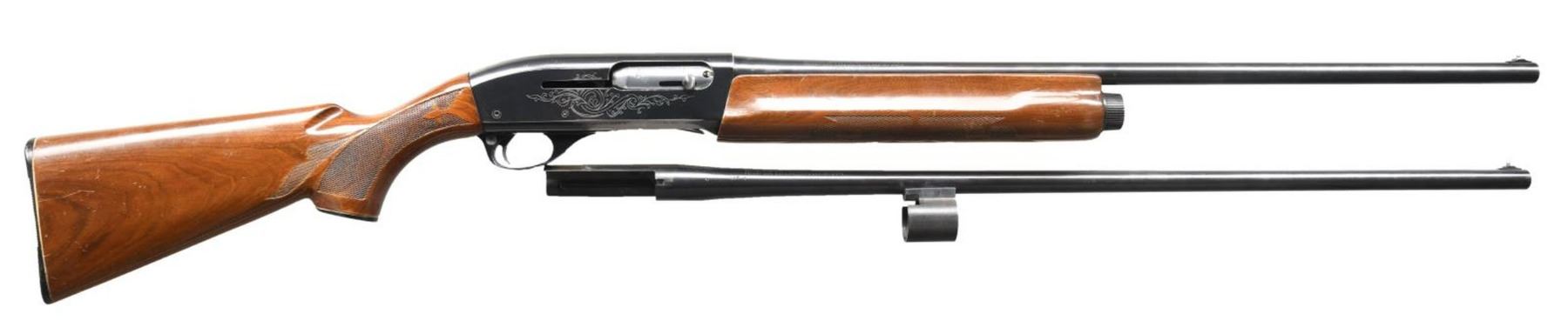 Cal. 20 Ga 2 3/4. S# L081114X. Bbl. 26" plain choked IC. Ramped silver bead sight. Blue finish. Checkered walnut stock & forend. UNATTACHED ACCESSORES: modified 31 1/2" plain bbl. choke. CONDITION: stock set shows scattered dings, flaking varnish, scratches, & handling wear. Metal retains 70% original blue w/ notable edge wear on bottom of receiver, further scattered edge wear, & light oxidation. Both bbls. have very good bores. (23-2389/MJC). MODERN. $600-900.