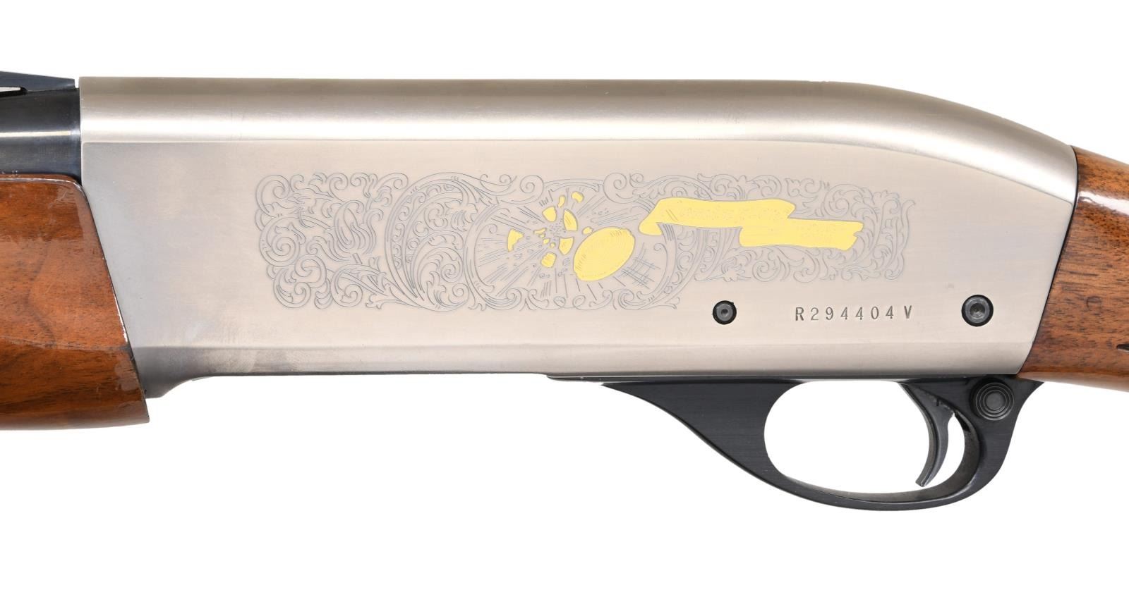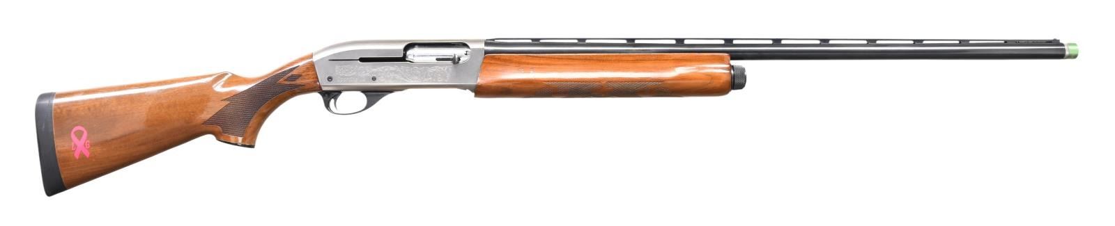 Cal. 12 ga. 2 3/4". S# R294404V. Bbl. 28" light contour vent rib with white front and steel mid beads. Supplied with Briley chokes, extended skeet tube included. Satin-finished receiver with scroll ornamentation. Left side has a gold-plated clay target and model markings. Earlier vintage gloss finished forearm with pressed checkering. Original gloss-finished forearm with cut checkering. Right side of the stock has a pink decal of a ribbon with the initials "LG". LOP: 14 1/8" over an aftermarket solid black declerator pad. CONDITION: satin-finished receiver shows light scuffs. 98% bbl. blue. Very bright bore. Forearm shows light wear with numerous scratches & marks. Original stock finish shows scattered marks, scratches, and small dents. (23-7038/DS). MODERN. $600-900.