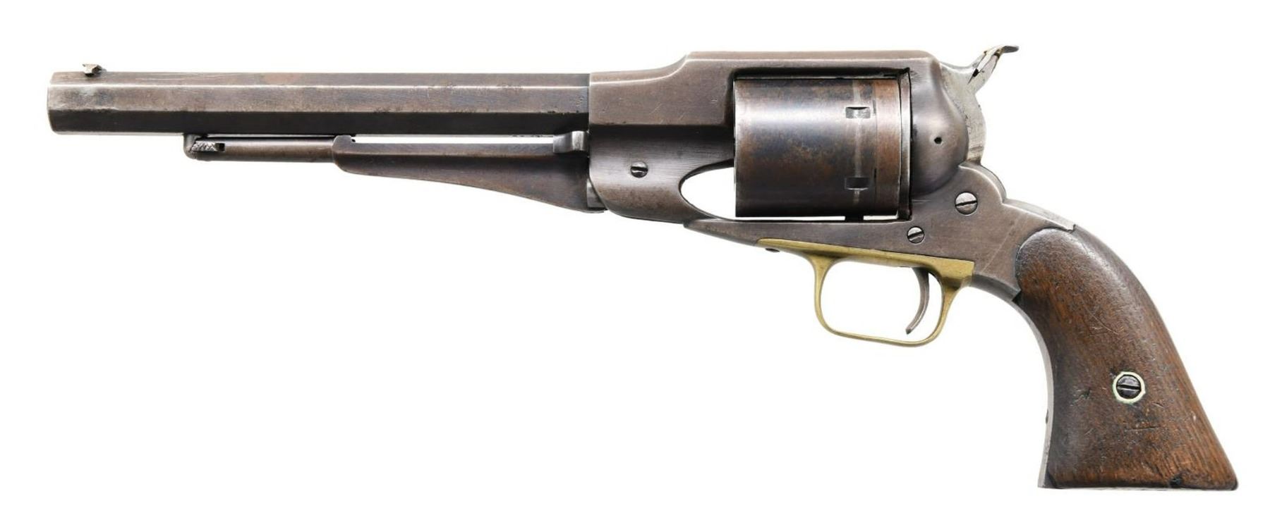 Cal. 44 CF. S# 5794. Bbl. 8". No front sight present but crude front sight provision is present. Fixed rear sight. Cartridge conversion of a Remington 1858 revolver. Cal. appears to be 44 but a 44 Russian & 44-40 will not fit. Brass trigger guard. Action cycles weakly & a few small parts appear to be missing. Back of hammer exhibits a crude repair. Smooth hardwood grips. CONDITION: grips show heavy wear w/ some chips, gouges at bottom & scattered dings. Trigger guard is a dull yellow patina w/ some oxidation staining. Balance of metal shows an older reblue that is mostly faded to brown w/ both grip straps being a silvery gray, scattered oxidation, pitting, dings & scratches. Bore shows scattered oxidation & pitting but strong rifling. (01-24444/MJC). ANTIQUE. $600-900.