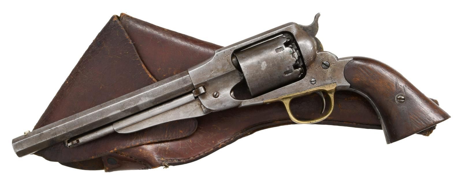 Cal. 44. S# 28977. Bbl. 8". Replacement fixed front & simple notch in frame rear sights. Matching S# on bottom Bbl. flat & left side frame under grips. Unfluted 6 shot cylinder w/ stops & "W" proof. Brass trigger guard w/ "W" proof & balance gunmetal gray steel. Unmarked smooth walnut grips. UNATTACHED ACCESSORIES: unmarked period brown leather hip flap holster crackled & crazed w/ repaired stitching. CONDITION: metal shows numerous dings, dents & impact marks. Grips are dented, scratched & slightly undersized. Bore is poor, w/ heavily worn rifling & pitting. (01-23598/CW). ANTIQUE. $700-900.