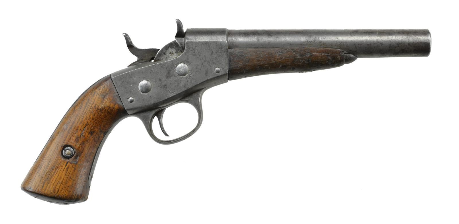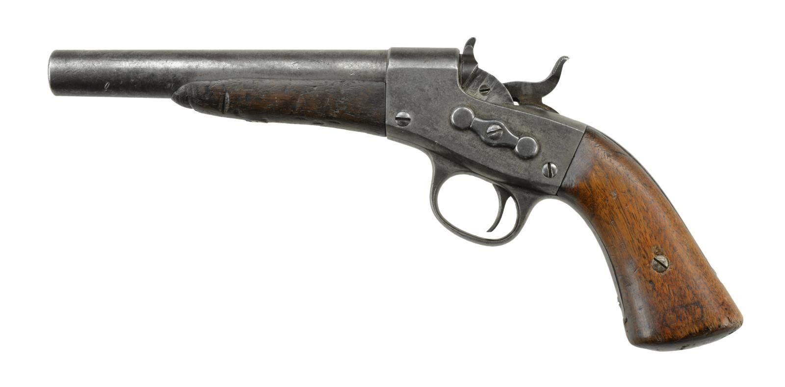 Cal. 50 CF. S# 251. Bbl. 7". Top of bbl. has anchor marking. Right side of frame has "P/F.C.W." inspector's marking. Left side of frame has two line Remington markings w/ last patent date of April 17th, 1866. Matching numbered bbl., forend, frame, trigger guard & grip. One piece walnut grip w/ hobbyist added reinforcement bolt simulating two piece grip. Faint inspector's cartouche on left side of grip. Walnut forend. CONDITION: To open breach the hammer must be held back. This issue will require attention to fix. No front sight present. Forend has a 2" crack at front right, wood overall shows heavy wear from the years w/ gouges, chips, dings & handling marks. Metal is a gray patina w/ overall oxidation staining, a couple small spots of light pitting & some scattered dings. Worn bore w/ scattered pitting. (01-21429/MJC). ANTIQUE. $300-500.