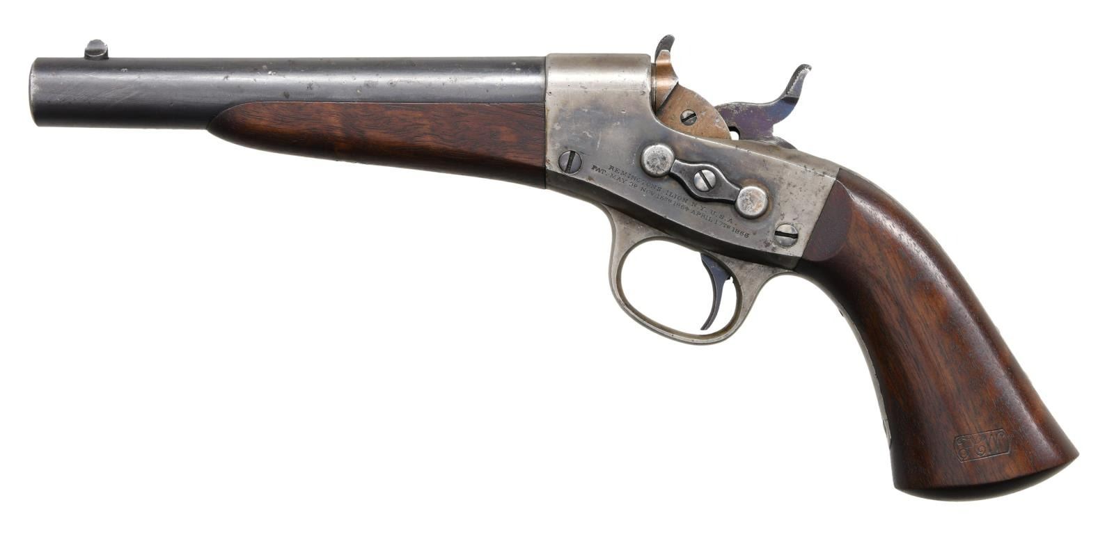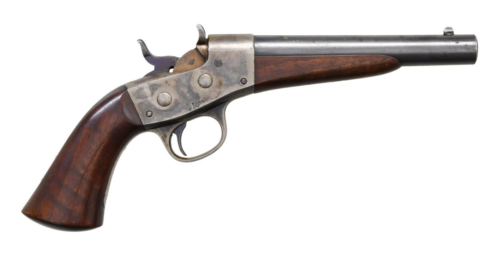 PISTOL. Cal. 50 CF. S# 5516. Bbl. 7" round w/ blade sight. Case colored rolling block action. Right side of frame has inspector's initials "P/F.C.W". Breech end of bbl. has the anchor marking. Walnut forearm & 1 piece grip. Left side has "FCW" cartouche. Modified from the Model 1865 for government contracts in the early 1870s. Total quantity unknown. CONDITION: bbl. retains 70% blue showing muzzle wear w/ spots of corrosion. Action shows 70% lightly visible case colors. Wood finish shows light wear & small marks. Left side of forearm has a small repaired chip. Bore retains strong rifling. PROVENANCE: The Collection of Edward Scott Meadows. (01-24704/DS). ANTIQUE. $2,000-3,000.