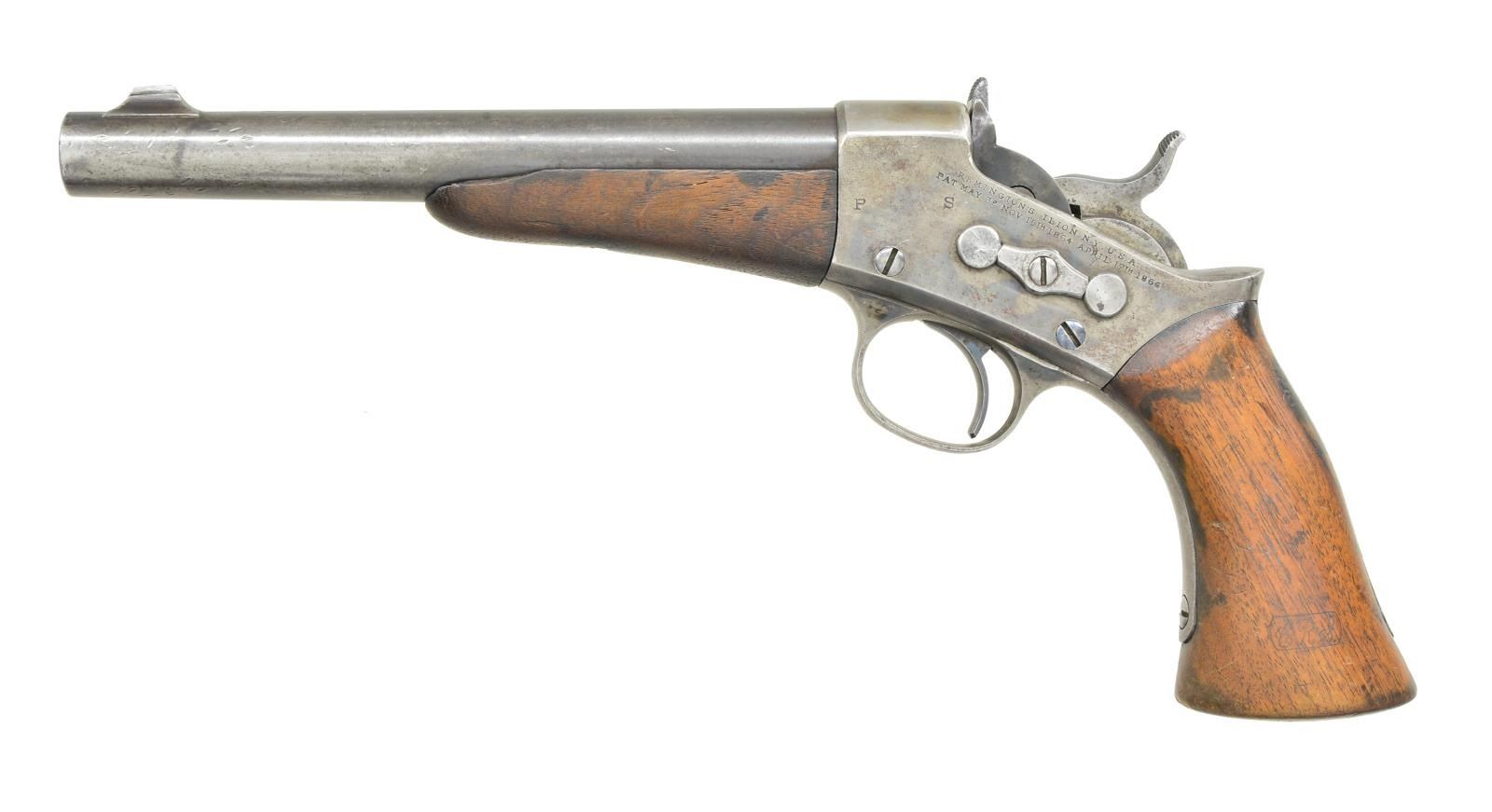 PISTOL. Cal. 50 CF. NSN. Bbl. 8" round with blade sight. Case colored action. Left side of receiver is marked "REMINGTONS, ILION N.Y. U.S.A. / PAT. MAY 3d, NOV. 15TH 1864, APRIL 17TH 1866". Walnut forearm and 1 piece stock with "ERS" cartouche on left panel. Approx. 6,000 mfg. 1872-1888. CONDITION: barrel retains 30% dull faded blue showing numerous small dents. Action shows 30% lightly visible case colors with scattered light pitting. Front sight is thinned and lowered. Forearm has worn appearance with chip along left barrel channel. Stock has dull worn appearance with wear, handling marks and series of dents at butt. Bore retains strong rifling. (01-21480/DS). ANTIQUE. $1,500-2,000.