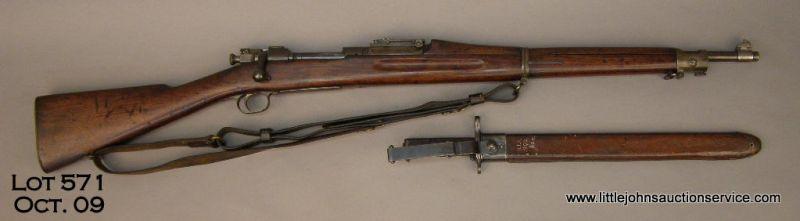 REMINGTON 1903, #239477, 30/06, 24” barrel, bayonet and scabbard, arsenal reworked for WWII. Barrel marked “05” with flaming bomb, stock shows “P” mark and faint cartouche on left side of stock. Stock has been sanded and refinished, bore is good. Est. $1,000-$2,000.