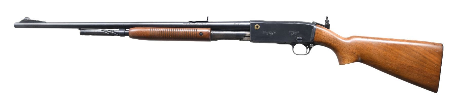Cal. 35 Rem. S# 56127. Bbl. 24" with ramped bead front sight and Marbles folding leaf rear; Lyman tang sight attached at rear of receiver using factory provided mounting holes. Spiral-fluted tubular mag. Walnut flat bottomed grooved forend and pistol grip buttstock with checkered aluminum buttplate. Mfg. 1935-1950; barrel codes July 1947. CONDITION: over 90% blue, showing scattered spots of peppery oxidation and light pitting. Stock finish has light wear plus scattered scratches and marks; professional epoxy repair at wrist. Near excellent bore. PROVENANCE: formerly of the estate collection of Don "Duck" Combs. (24-5292/NW). CURIO. $600-900.