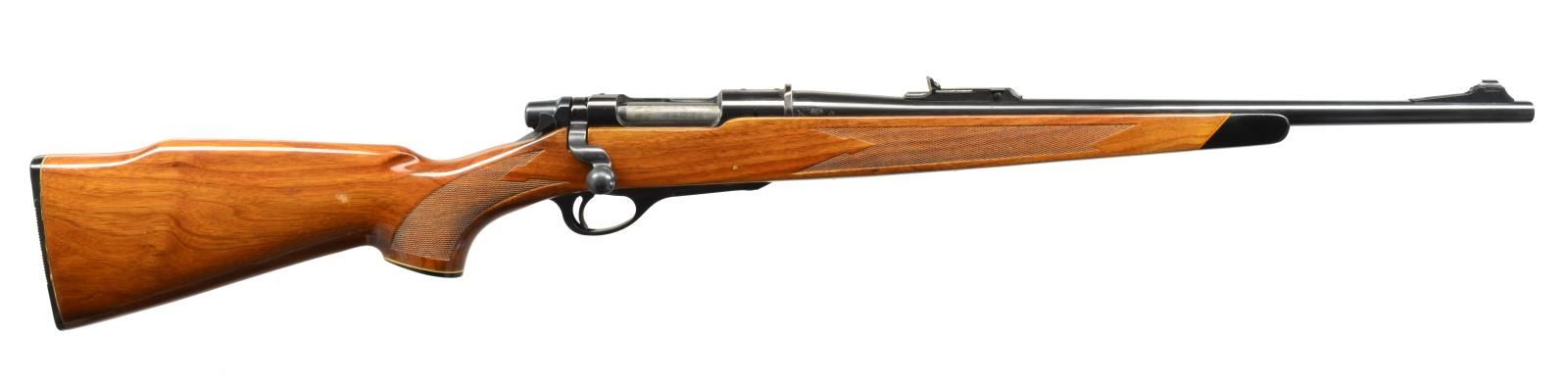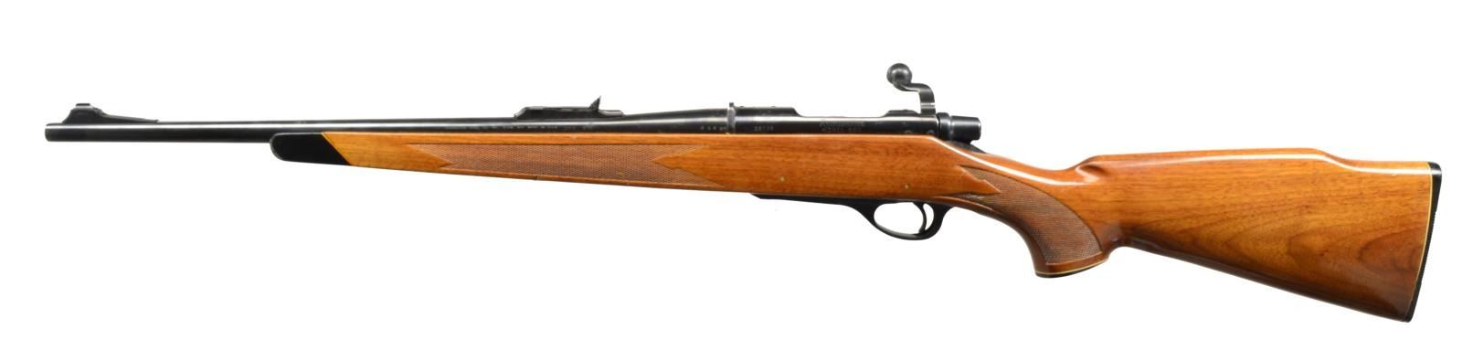 Cal. 308 Win. S# 98738. Bbl. 20" w/ ramp mounted bead front sight & adj. rear sight missing elevator. Monte Carlo stock w/ pressed checkering, black forearm tip, grip cap & original buttplate w/ white line spacers. Nylon floorplate. Bbl. code indicates Jan. 1968. mfg. CONDITION: over 95% original blue. Stock shows scattered handling marks & sm. dents. Sound mechanics. Bore retains strong rifling w/ sm. spots of very light pitting near muzzle. (20-1563/DS). CURIO. $400-600.