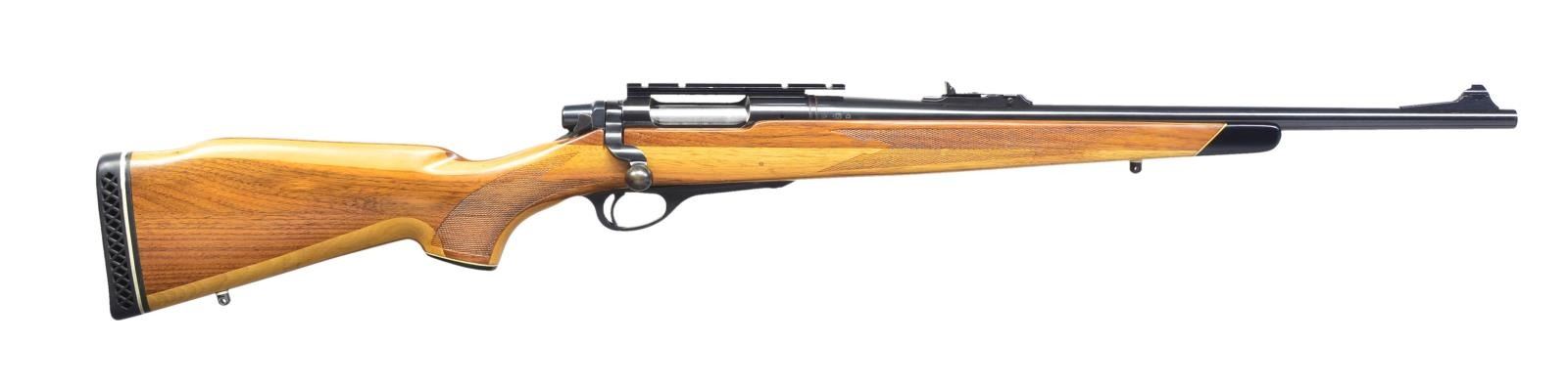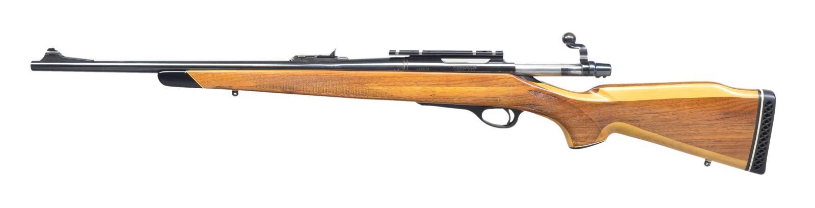 Cal. 350 Rem Mag. S# 103618. Bbl. 20" w/ screwed on ramp front w/ dovetail bead sight. Adj. rear sight. Checkered laminated stock w/ black forend tip & vented black Remington recoil pad. Black pistol grip cap w/ white diamond. Original floorplate w/ typical bow in it. Receiver mounted w/ one piece Weaver. CONDITION: bbl. & receiver have good original blue w/ a few minor light scratches. Stock has original finish w/ minor handling marks. Bore is good w/ fine pitting in grooves. (19-1008/BT). MODERN. $700-1,200.