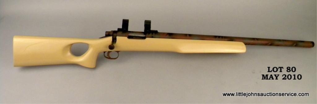 REMINGTON 700, # A6402772, .22 PPC cal., 25" bull barrel, adjustable trigger, scope mounts, jeweled bolt, Mc Millan type bench rest stock, camouflage finish. Rifle is in very good condition overall, showing little use. Bore is excellent, stockvery good, showing a chip at the base of the pistol grip, and minor scratches and mars. Est. $300-$600.