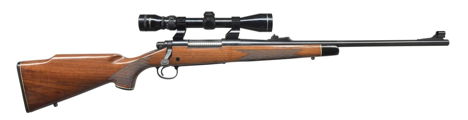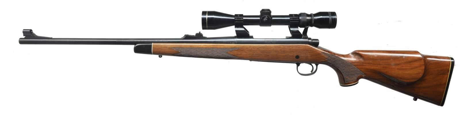 Cal. 270 Win. S# D6822150. Bbl. 22" w/ hooded ramp bead front sight & ramp mounted adj. U notch rear sight. Tasco 3-9x40 gloss finished scope w/ duplex reticle on see through mts. Jeweled bolt body. Box mag. w/ hinged floorplate. Monte Carlo cheekpiece walnut stock w/ cut skip line checkering, swivel bases, forearm tip, grip cap & buttplate having white line spacers. CONDITION: 98% blue showing sm. spots of corrosion. Stock finish shows a few sm. marks & mildew spots. Bright bore w/ sharp rifling. Scope has good optics. (20-2750/DS). MODERN. $500-700.
