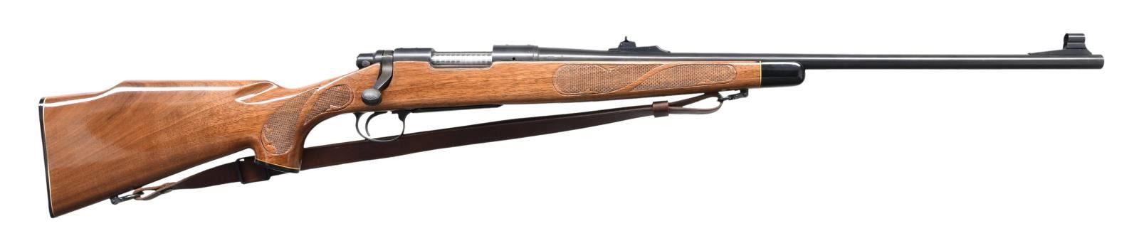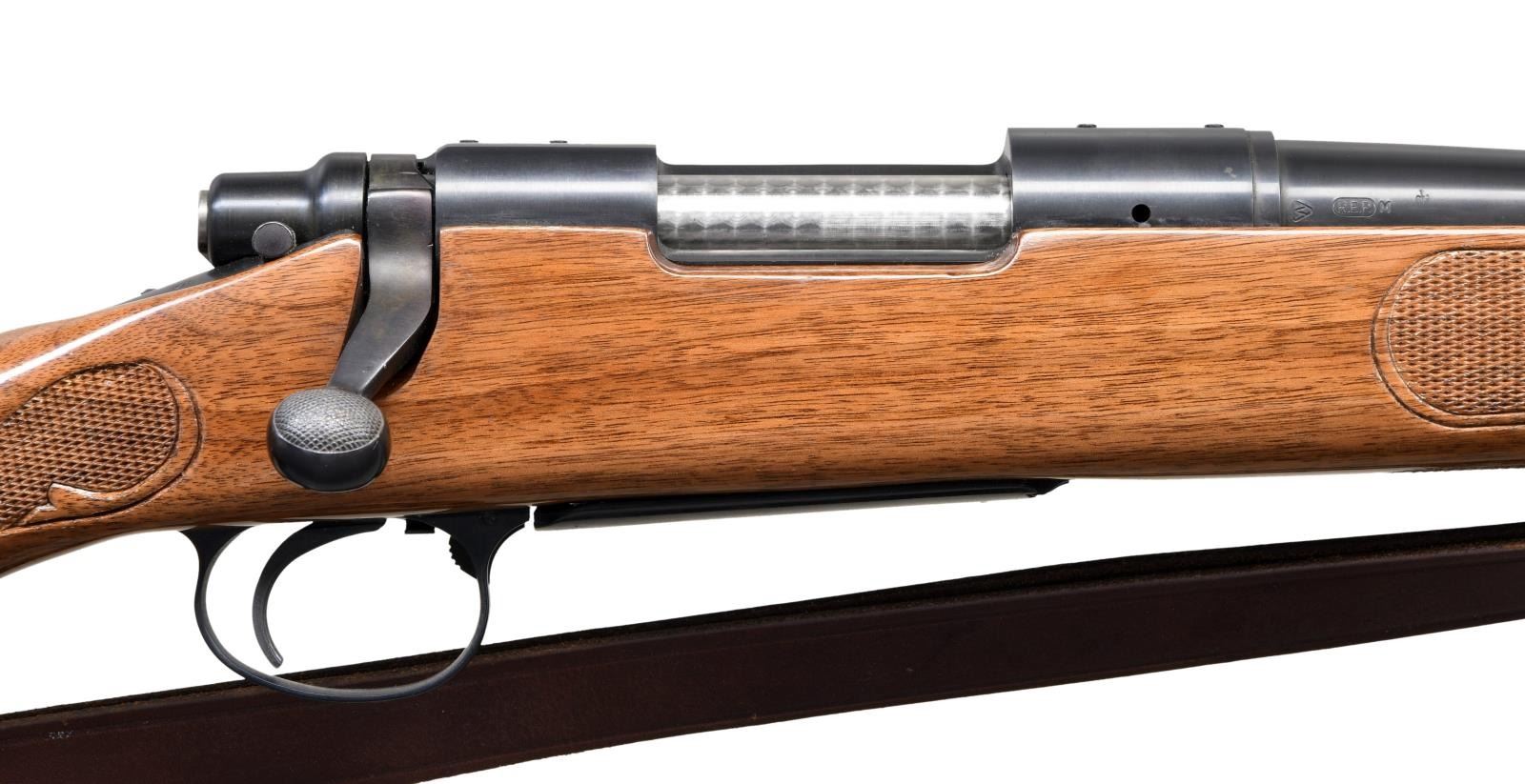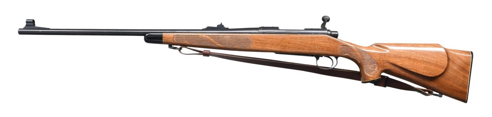 Cal. 17 Rem. S# 6626409. Bbl. 24" with sporting sights. Action has a jeweled bolt and hinged floorplate. Monte Carlo cheekpiece walnut stock with pressed checkering, black forearm tip and grip cap, gloss finish, & original buttplate. Military-style leather sling on QD swivels. CONDITION: 98% blue with small spots on the bbl. & receiver. Very good stock finish. Very good, bright bore. (23-6540/DS). MODERN. $800-1,200.