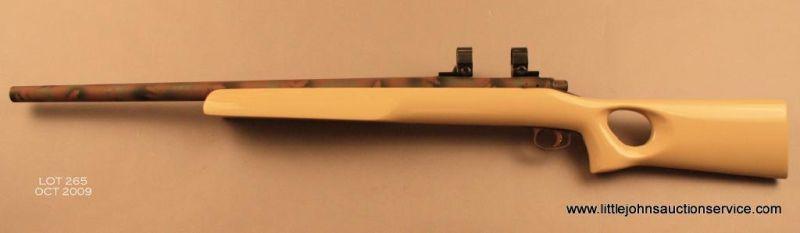 REMINGTON 700 Bench Rest rifle, # A6402772, .22 PPC cal., 24” bull barrel, camouflage finish with beige fiberglass McMillan type thumb hole bench rest stock. Rifle is in very good to excellent condition, bore is bright, jeweled bolt, receiveris drilled and tapped with scope mounts and rings. Est. $400-$800.