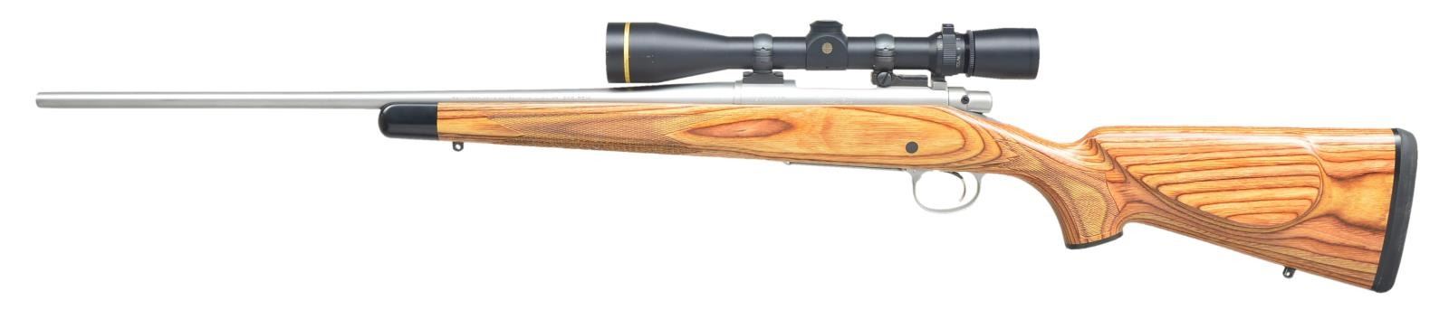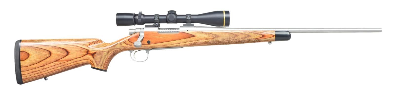 Cal. 260 Rem. S# S6492279. Stainless finished rifle w/ 22" bbl. w/out sights. Leupold VARI-X III 3.5-10x40mm scope w/ duplex reticle on Leupold style rings & 2 piece bases. Laminate wood checkered pistol grip stock w/ Rem. recoil pad. CONDITION: near excellent overall including bore. (22-2834/MD). MODERN. $750-1,100.