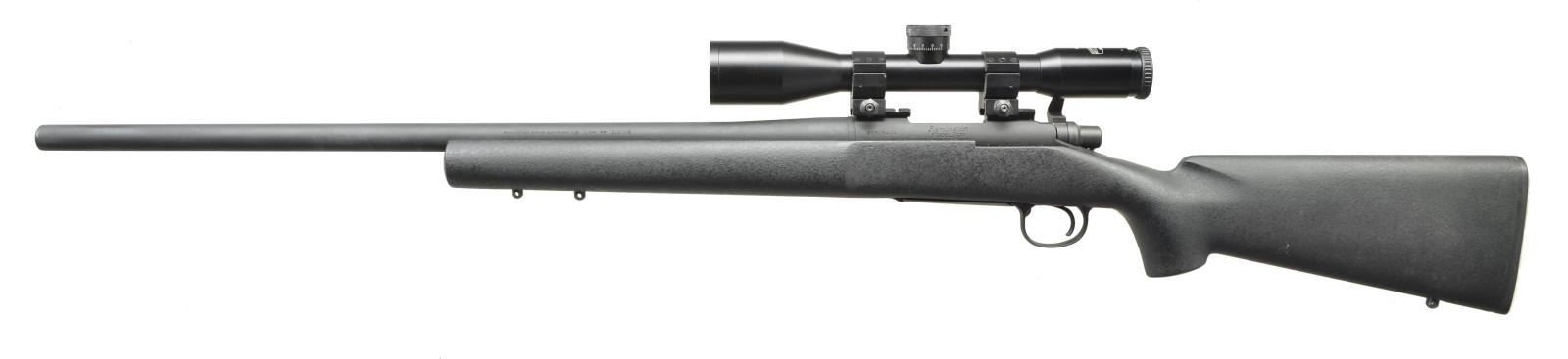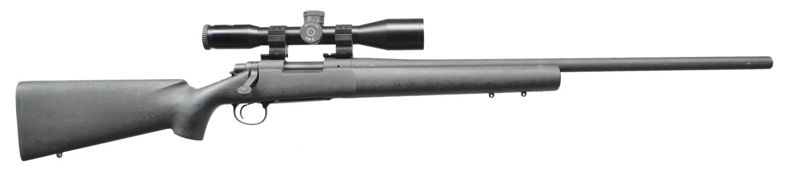 Cal. 308 Win. S# G6609404. Bbl. 26" heavy weight without sights. 2 Lug action. Hinged floorplate. Matte black metal finish. Fiberthane palm swell stock with black crinkle finish, swivel bases and thin black Remington pad. Schmidt & Bender 30mm 10X42 matte finished scope with target turrets and mil dot reticle. CONDITION: metal retains 98% finish. Stock shows a few small marks. Bright near excellent bore. Scope has bright optics. (22-4688/DS). MODERN. $1,750-2,500.
