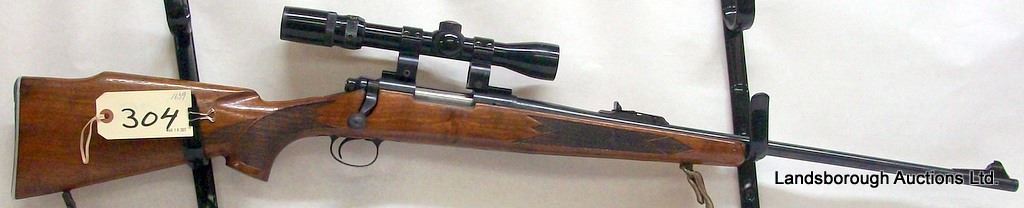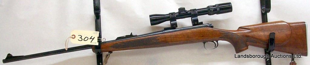 NON-RESTRICTED, BOLT ACTION, 222 REM, 24" BARREL, SN 73562. WOOD HAS SOME SCRATCHES, BLUING HAS SOME LIGHT PITTING, BORE PITTED. COMES WITH BUSHNELL BANNER 3-9 X 32 SCOPE AND SLING.
