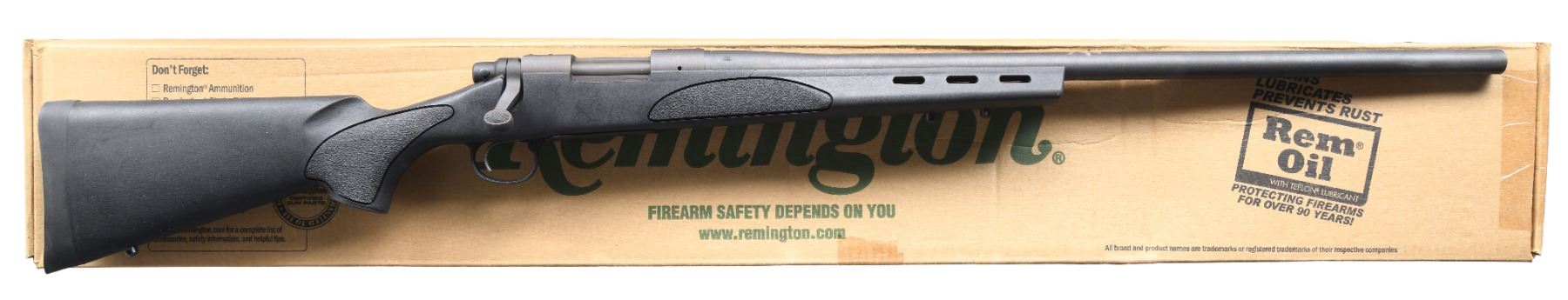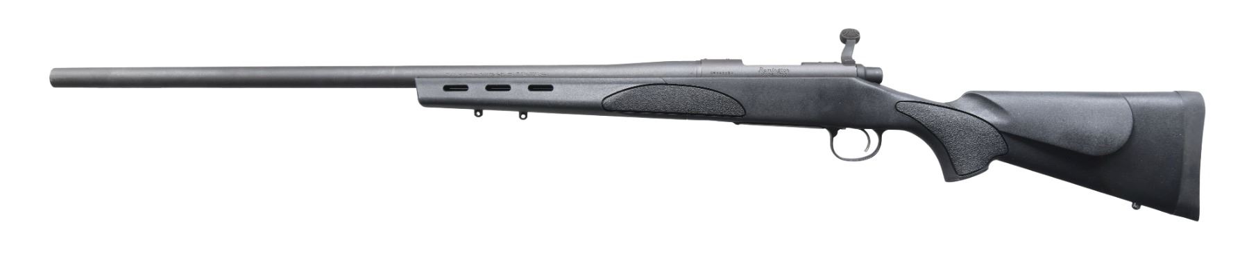 Cal. 17 Rem Fireball. S# G6646650. Bbl. 26" Varmint weight w/o sights. Ventilated Matte black finished beavertail synthetic stock. UNATTACHED ACCESSORIES: foam-lined box containing owner's manual, safety brochure, NRA card, Rem Oil gun wipes & safety lock. CONDITION: as new w/ box. (24-3676/DS). MODERN. $600-900.