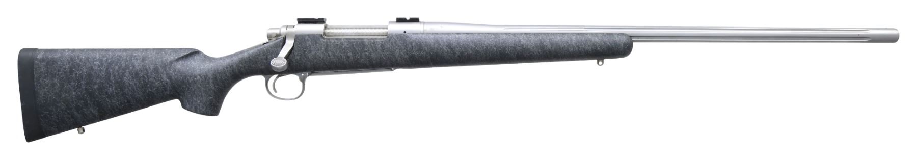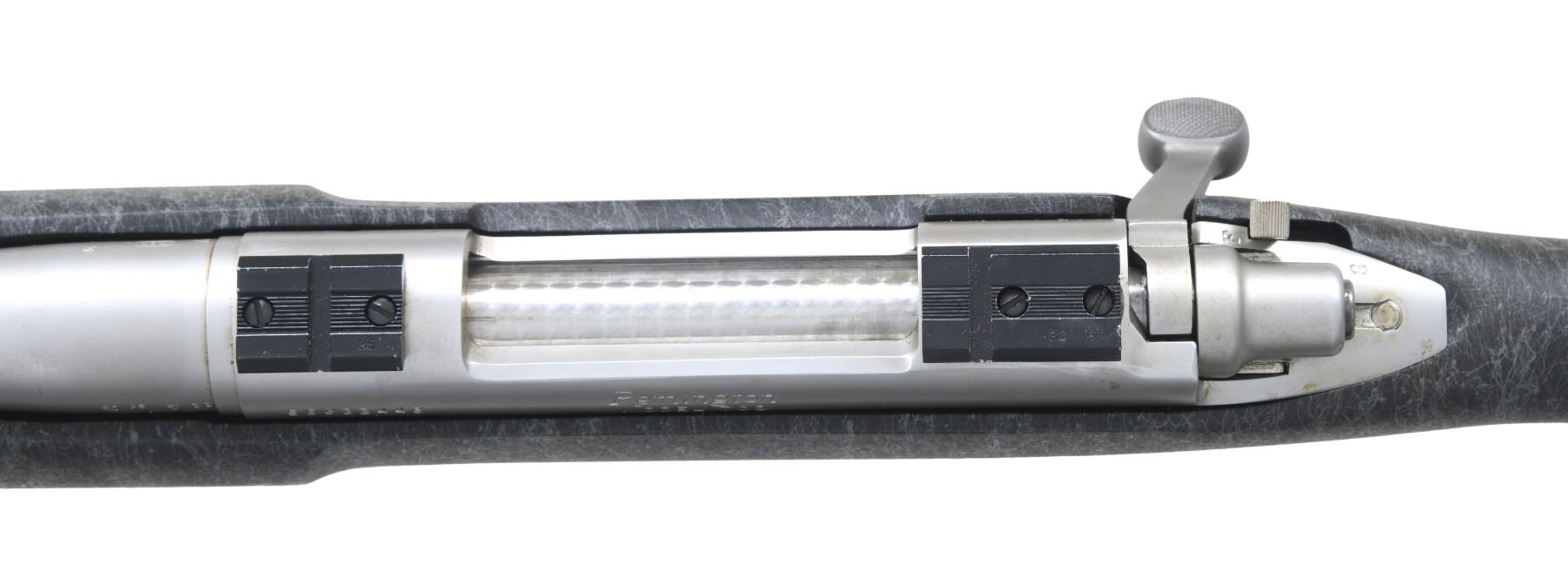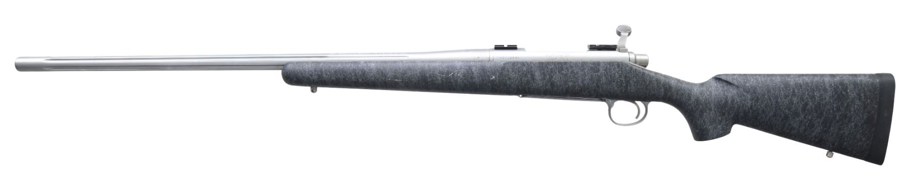 Cal. 7mm STW. S# S6332448. Bbl. 26" fluted. Rifle lacks sights but has receiver two Weaver bases. Stainless finish with jeweled bolt body. Gray carbon fiber stock set with factory recoil pad & bottom mounted sling studs. LOP: 13 1/2". CONDITION: stock shows some light staining, scuffs & handling marks. Metal shows a few specks of light oxidation & some scattered light handling marks. Action functions properly when hand cycled . Very good bore. (25-1184/MJC). MODERN. $800-1200.