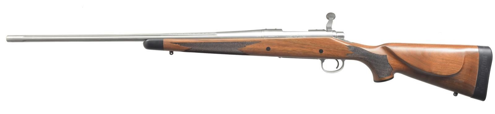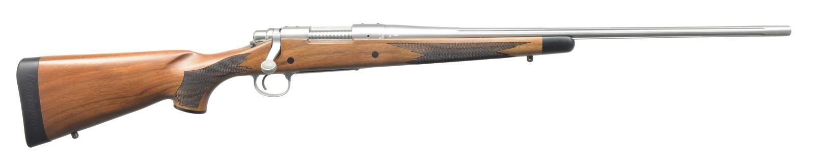 BOLT ACTION RIFLE. Cal. 257 Roberts. S# S6699770. Bbl. 24" fluted of sporter weight w/out sights. Stainless steel bbl. & action. Satin finished classic style cheekpiece walnut stock w/ contrasting forearm tip & grip cap, point pattern cut checkering, swivel bases & solid black Rem. pad. Floorplate has gold filled ornamentation w/ inscription "257 / Roberts / 75th / Anniversary / Limited". Action marked "MODEL 700 LIMITED". Limited production in 2009. UNATTACHED ACCESSORIES: original box containing owner's manual, hang tag & trigger lock. CONDITION: as new w/ box. (20-2894/DS). MODERN. $700-1,000.