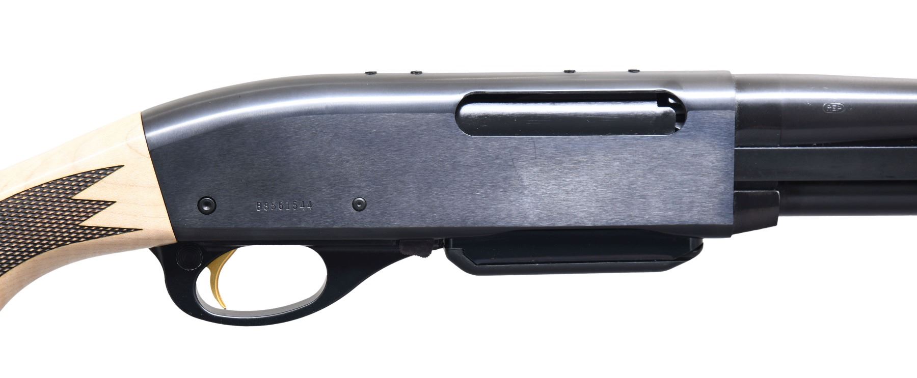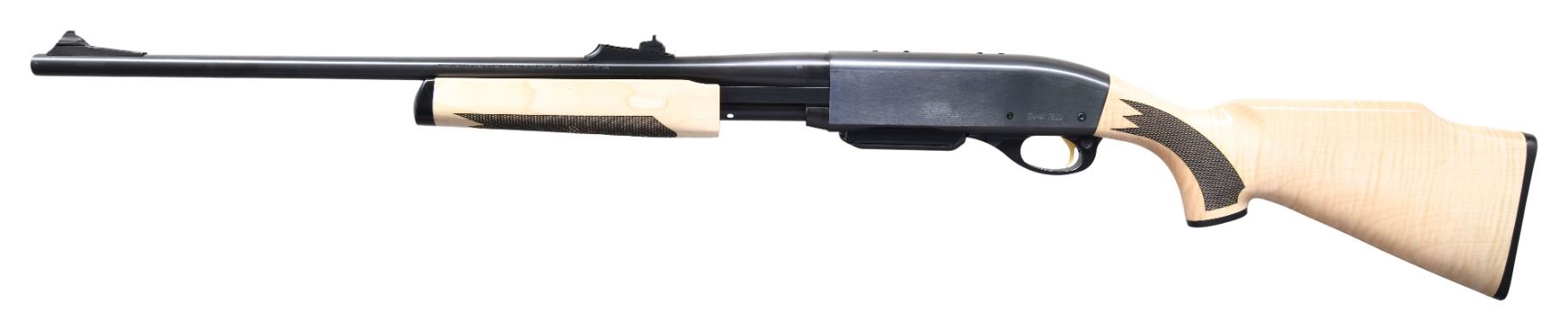 RIFLE. Cal. 7mm-08. S# B8561544. Bbl. 22". Ramped white bead front sight. Sporting style rear sight. Receiver is factory drilled & tapped for scope mounting. Limited edition maple Model 7600 7mm-08 with only 250 rifles made. Blued & anodized finishes with gold trigger. Checkered maple stock set. Forend marked "One of 250 7600 7mm-08 Remington" on underside. MAGS: 1-5 rd. UNATTACHED ACCESSORIES: matching numbered factory manual. CONDITION: all aspects near excellent with a couple minor handling marks. (25-1500/MJC). MODERN. $1200-1800.