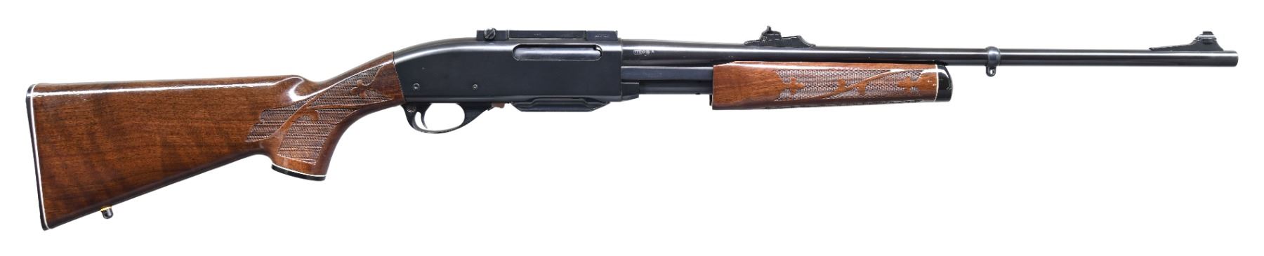 Cal. 30-06. S# 8314506. Bbl. 22 1/2". Ramped bead front sight. Adjustable sporting rear sight. Blued finish with anodized trigger guard. Checkered pistol grip stock & forend with fleur-de-lis carvings & bottom mounted sling studs. MAGS: 1-4 rd. CONDITION: stock set has added varnish finish with some chips forming on left side of butt, scattered light flaking & handling marks. Metal retains 95% blue & anodizing with some light handling marks, light oxidation & edge wear. Action functions properly when hand cycled. Bright near excellent bore. (25-1499/MJC). MODERN. $800-1200.