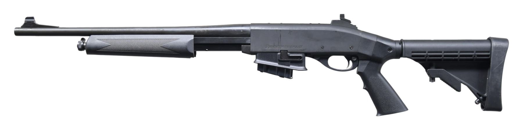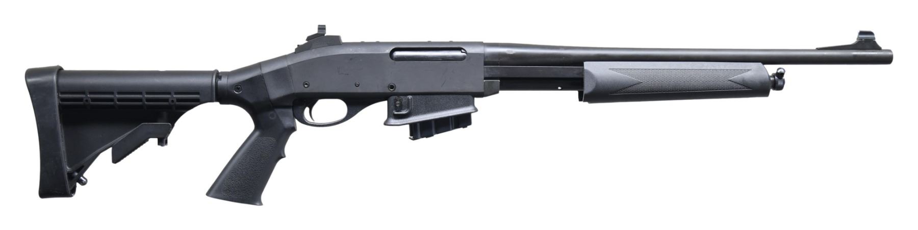 Cal. 223 Rem. S# B8543585. Bbl. 16 1/2". Ramped white bead front sight. Wilson Combat ghost ring rear sight. Receiver is factory drilled & tapped for further sight mounting. Pump action police rifle that takes standard AR15/M16 mags. Parkerized finish. ATI collapsible stock, black synthetic forend & pistol grip. Bottom mounted sling studs. MAGS: 1-10 rd. unmarked. CONDITION: stock set shows some light handling marks. Metal retains 90% original parkerized finish with some light oxidation spots, scattered scuffs, edge wear & handling marks. Action functions properly when hand cycled. Bright near excellent bore. (25-3400/MJC). MODERN. $700-1100.