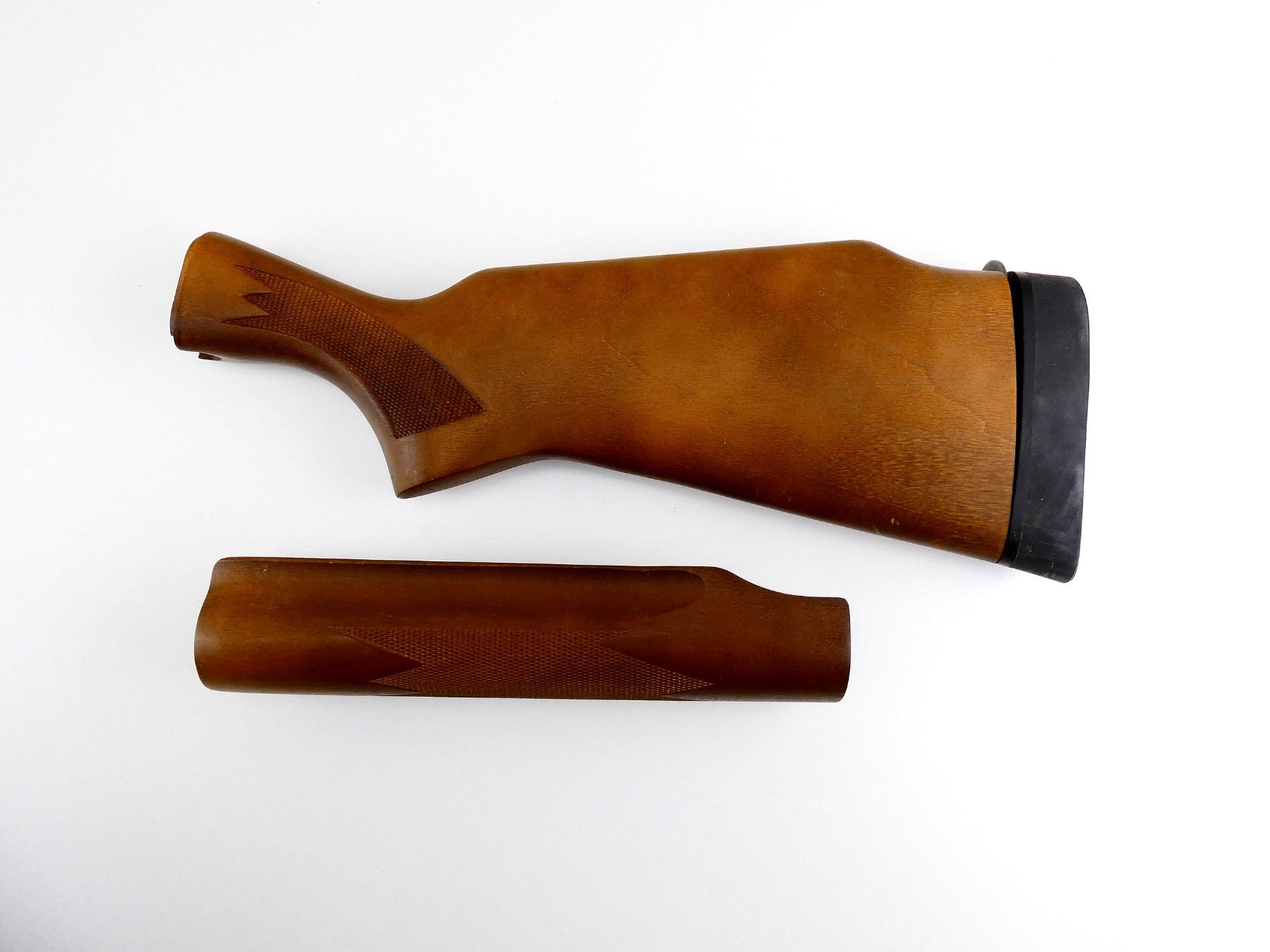 LOT INCLUDES; (1) WOODEN BUTT STOCK, CHECKERED, PISTOL GRIP, BLACK RUBBER RECOIL PAD, SHOWS LIGHT WEAR / TEAR, OAL APPROX. 13.25" & (1) WOOD FOREARM, CHECKERED, OAL APPROX. 9". MAY REQUIRE FITTING. SEE PHOTOS.