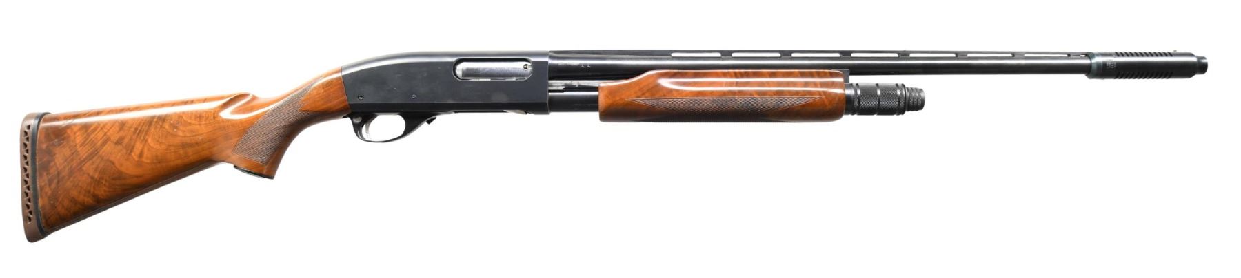 Cal. 20 ga. 2 3/4". S# 789725X. Bbl. 26" vent rib over an added Cut's compensator w/ spreader tube. Original choke marking was Skeet. Steel front & mid beads. Mag. tube has a weighted cap. Forearm & capped pistol grip C grade stocks of fancy walnut w/ hand checkering & dog's head grip cap. LOP: shortened to 13 5/8" over a poorly fit Beretta pad. CONDITION: over 90% blue showing slide wear. Stock shows scattered light marks. (24-3990/DS). MODERN. $300-500.