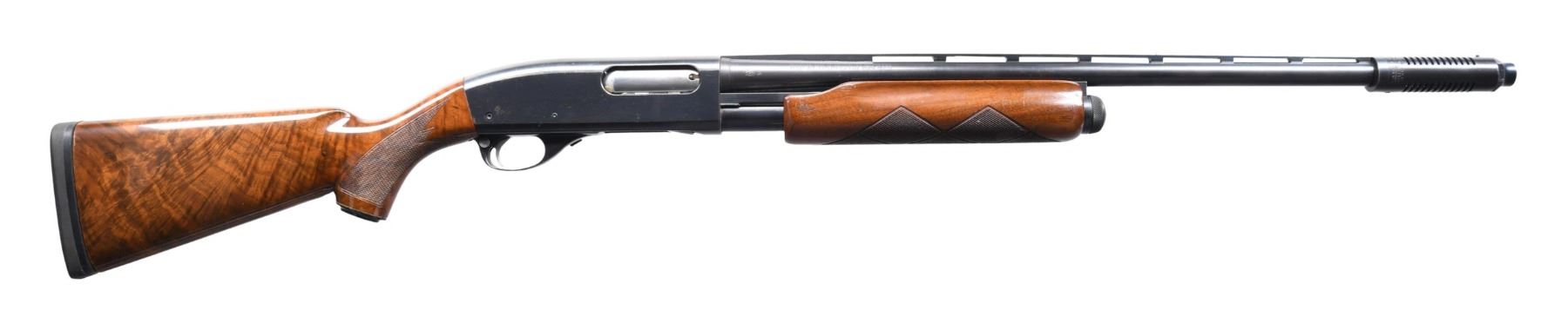Cal. 16 ga. 2 3/4". S# 589726W. Bbl. 25 1/2" vent rib over aftermarket Cut's compensator w/ spreader tube. Original forearm w/ machine checkering. C grade replacement trap stock w/ fancy walnut w/ hand checkering & hard rubber grip cap. LOP: altered to 14" over a poorly fit Pachmayr presentation pad. CONDITION: over 80% lightly worn blue showing slide wear, handling marks & spots of freckling. Wood finish shows wear & handling marks. Very good bore. (24-3992/DS). MODERN. $200-300.