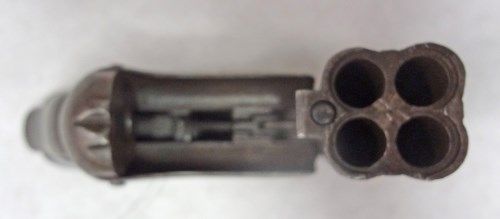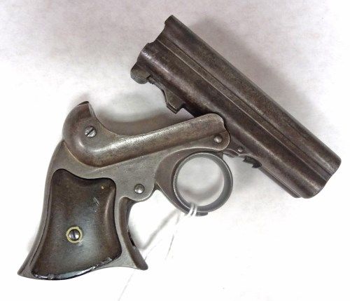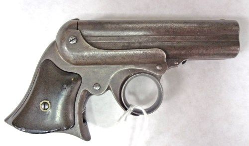 This pistol was manufactured between 1863 and 1888. The left side of the barrels are marked with the one line address and the Elliots patent date is marked on the opposite side Matching serial number on the frame and barrels. Blade front and frame notch rear sights, all nickel finish with blue trigger and fitted with smooth walnut grips. ALL COMPLETE AND IN VERY GOOD CONDITION, ESTIMATE, $1750.00 TO $1900.00