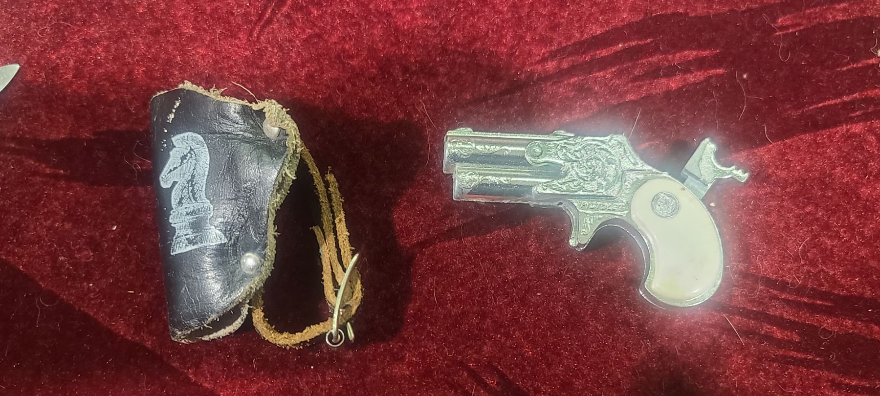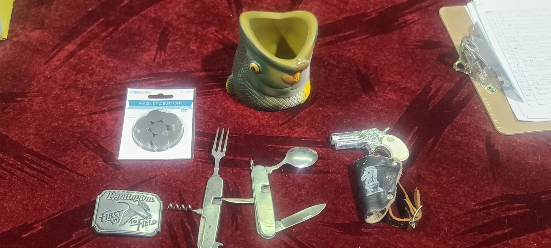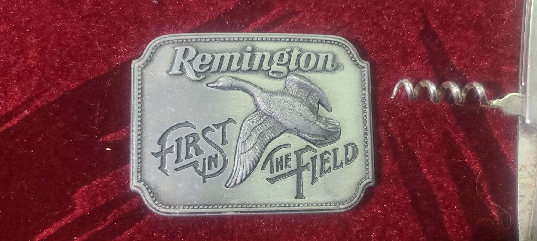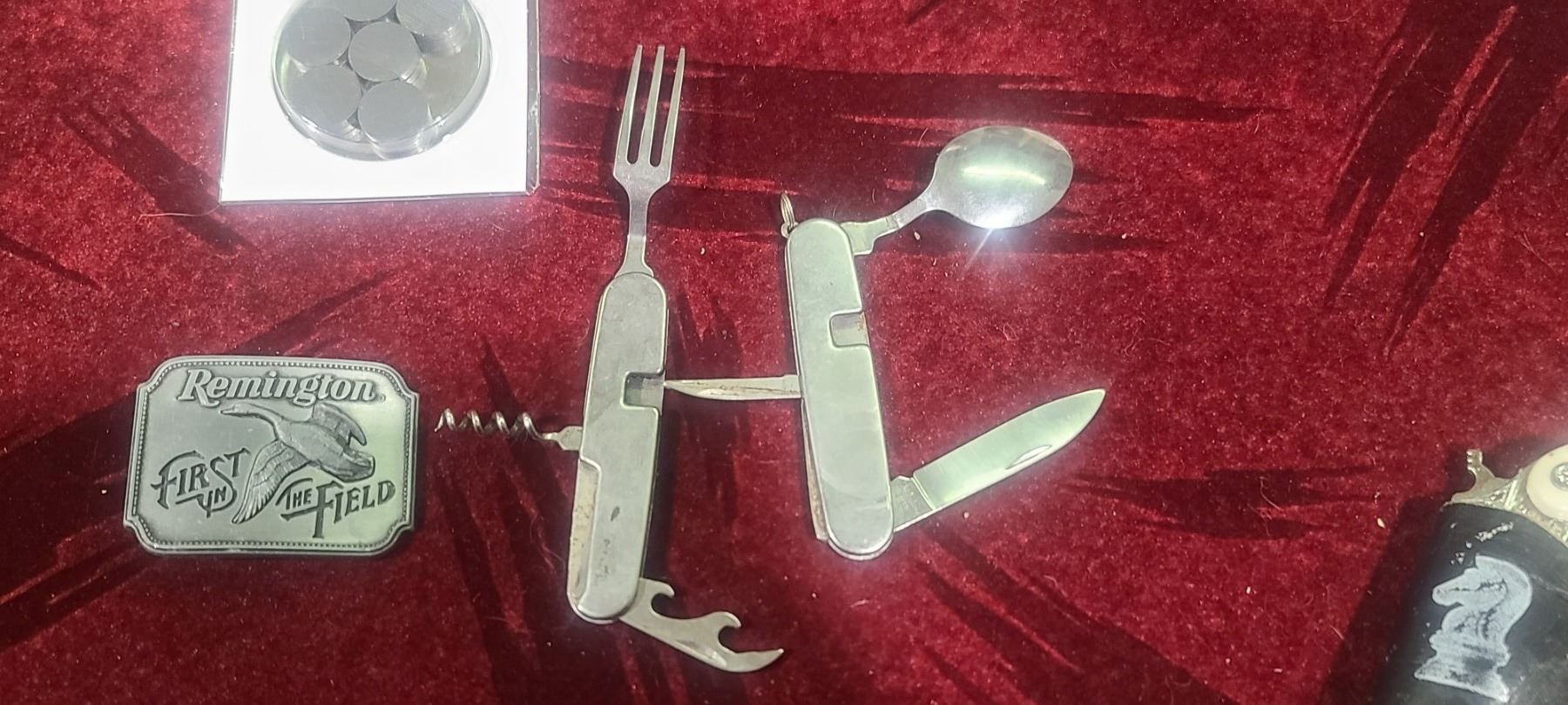 REMINGTON BELT BUCKLE, CAP GUN, CAMPING UTENSIL