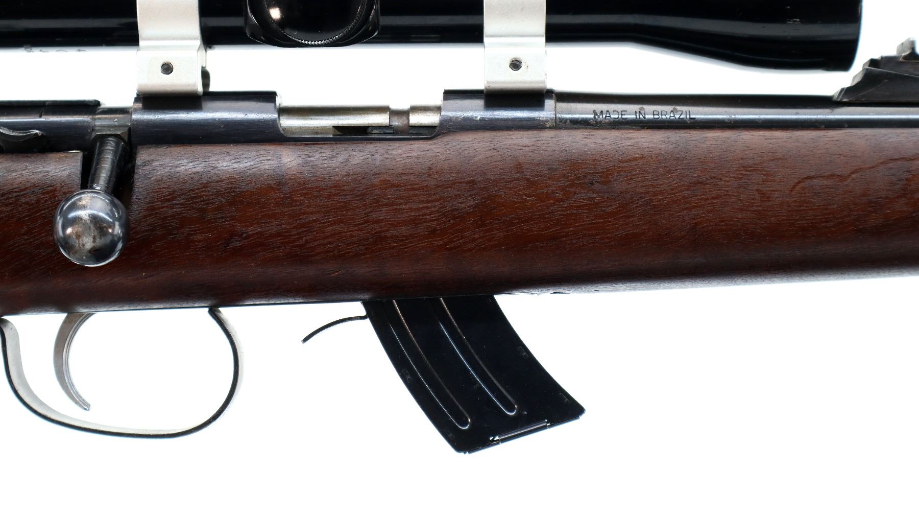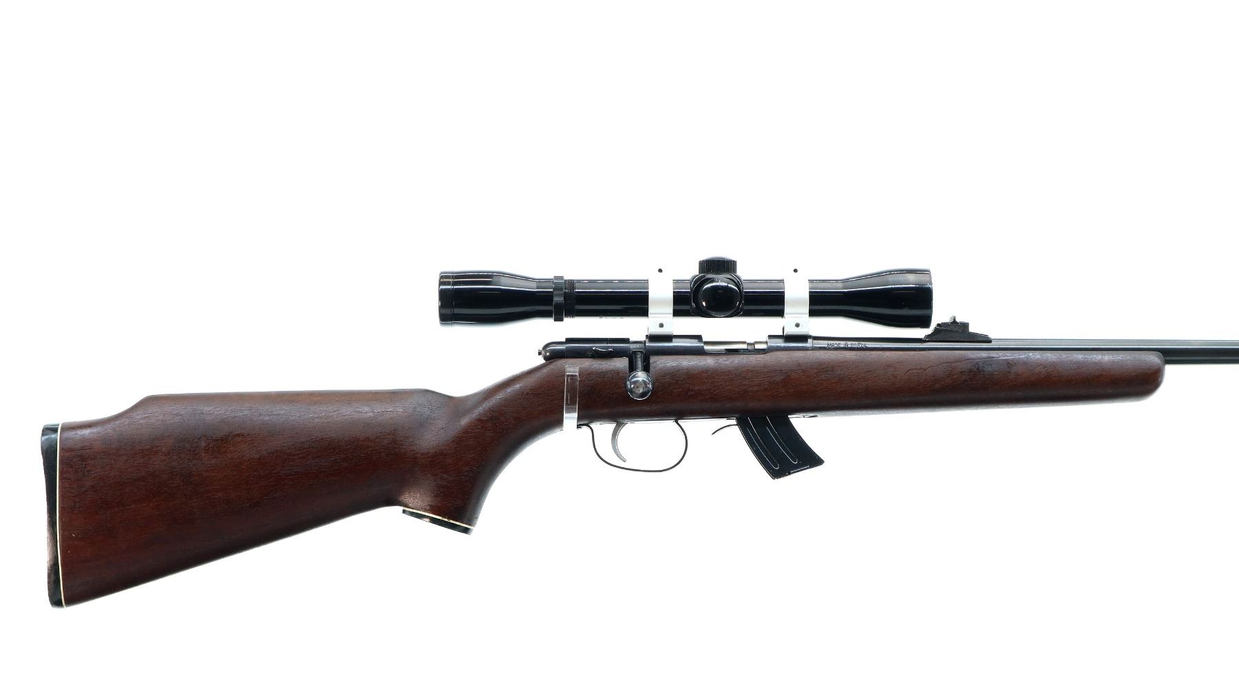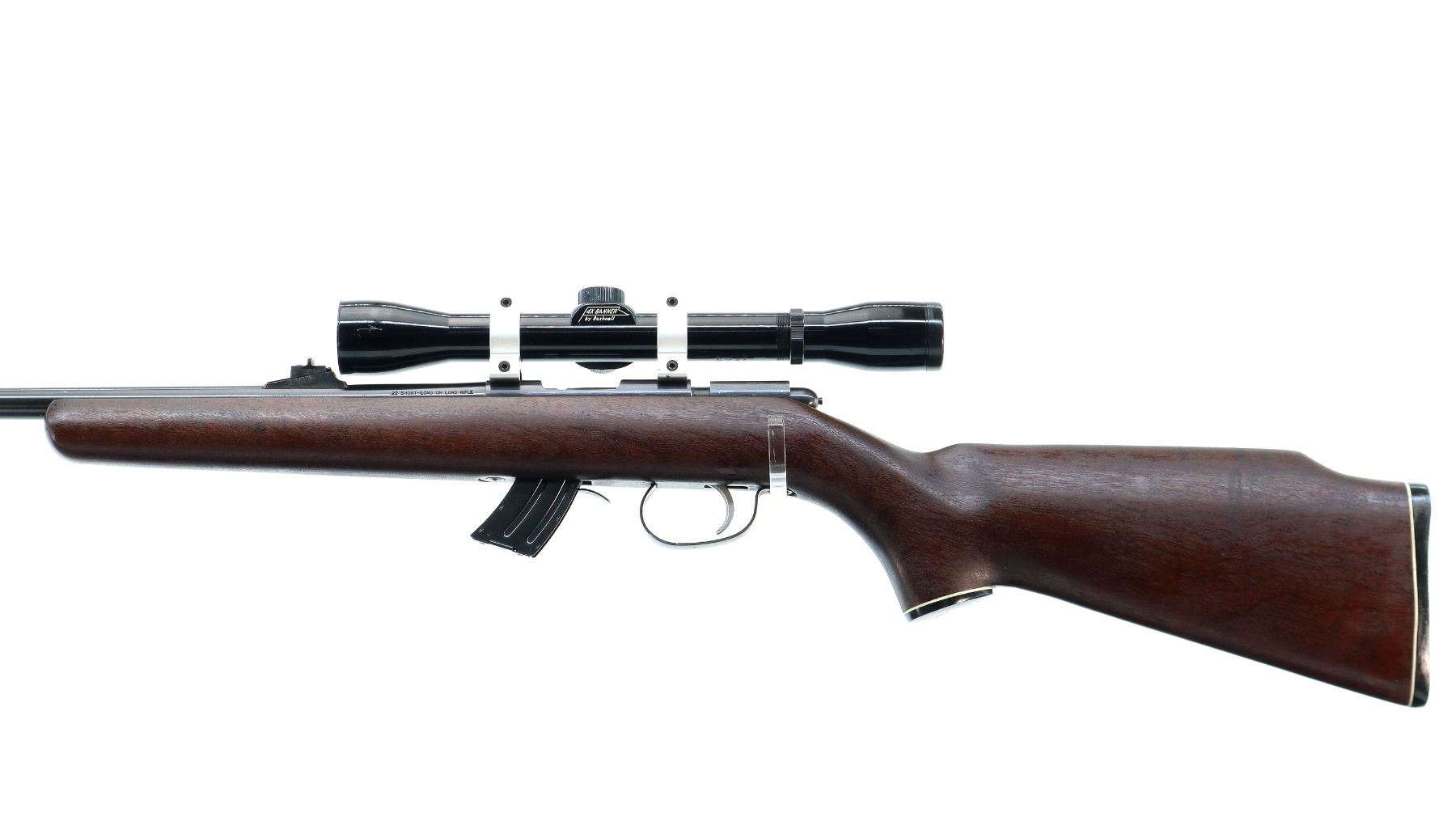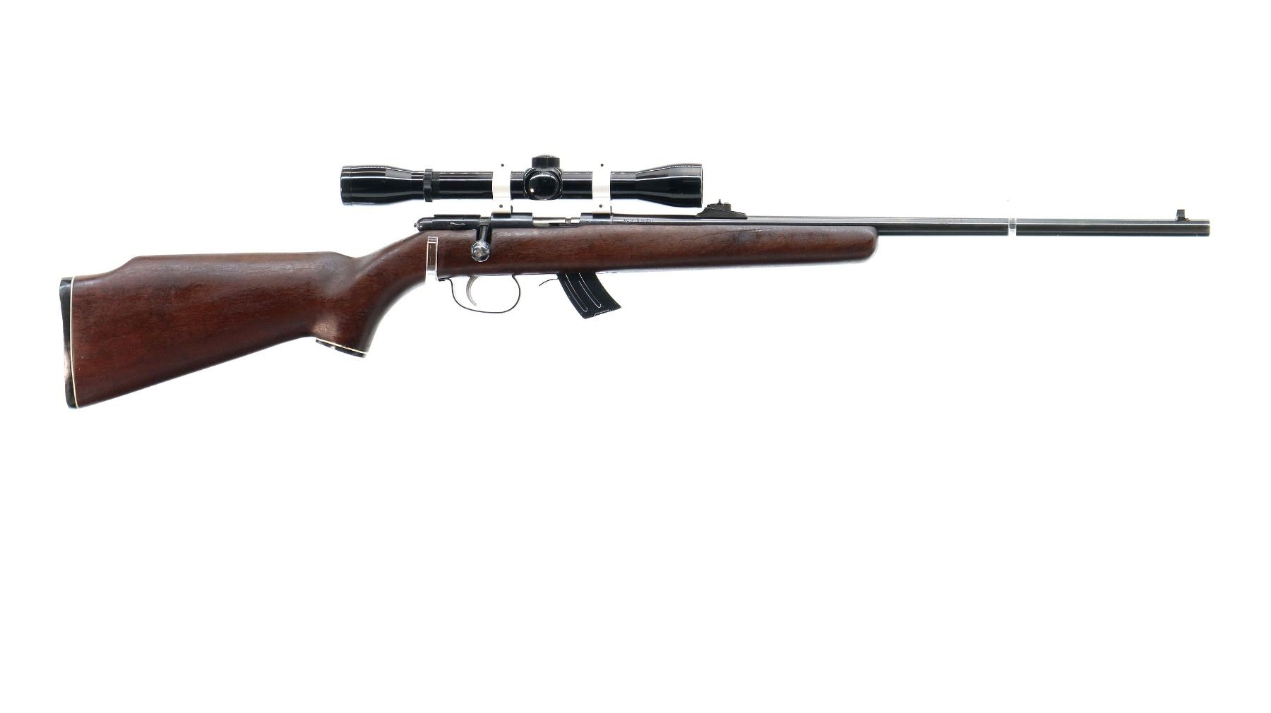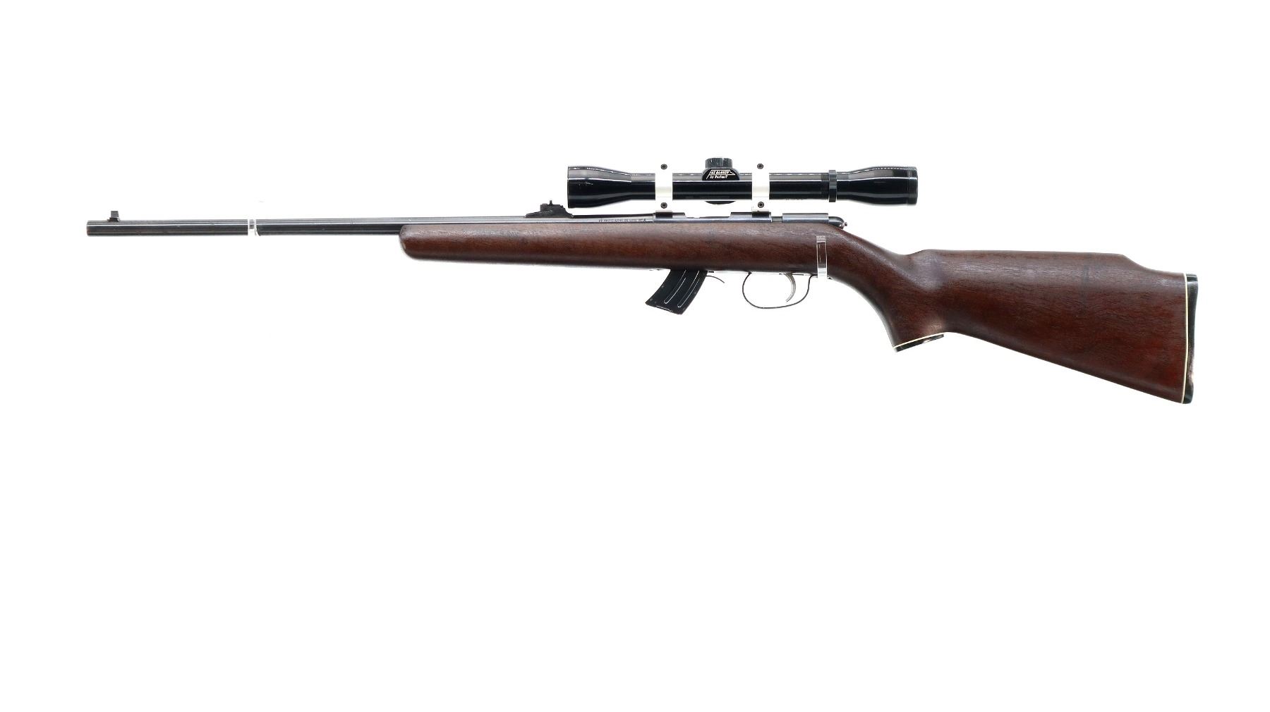 Main Description: Blade front sight, adjustable u notched rear sight, blued finish, grooved receiver with Bushnell Banner 4x32 scope installed, clear optics with tapered post with fine line reticle. One piece wood stock, pistol grip, raised comb, grooved black polymer butt plate, grip cap.