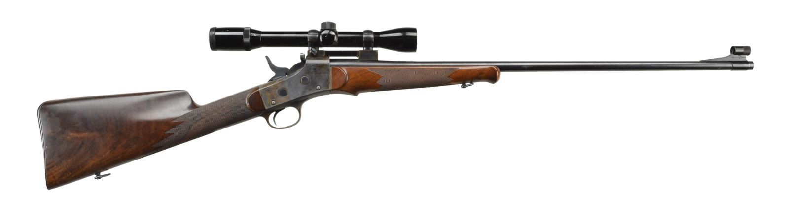 RIFLE. Cal. 7x57. NSN. Original bbl. is shortened to 28" & recrowned. Bbl. has original marking "CAL 7.M.M." along w/ plug screws in rear sight holes. Hooded bead front sight on Redfield bbl. band ramp. Receiver & bbl. are fitted w/ case colored one piece mt. holding Bushnell Custom 4x32 scope w/ post & crosshair reticle. Receiver retains original case colored finish. Custom Schnabel tipped forearm & straight grip cheekpiece stock of fancy black walnut w/ point pattern hand checkering & sling swivels. LOP: 13 1/2" over steel buttplate. CONDITION: bbl. 90% reblued finished w/ sm. spots of remaining pitting. Action retains 80% lightly faded original case colors. Wood shows scattered sm. marks. Bore has strong rifling w/ slightly darkened appearance. Scope has minor obstruction in lower portion of view along w/ good exterior finish. (22-2314/DS/MD). MODERN. $400-600.