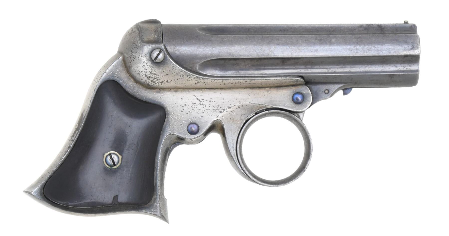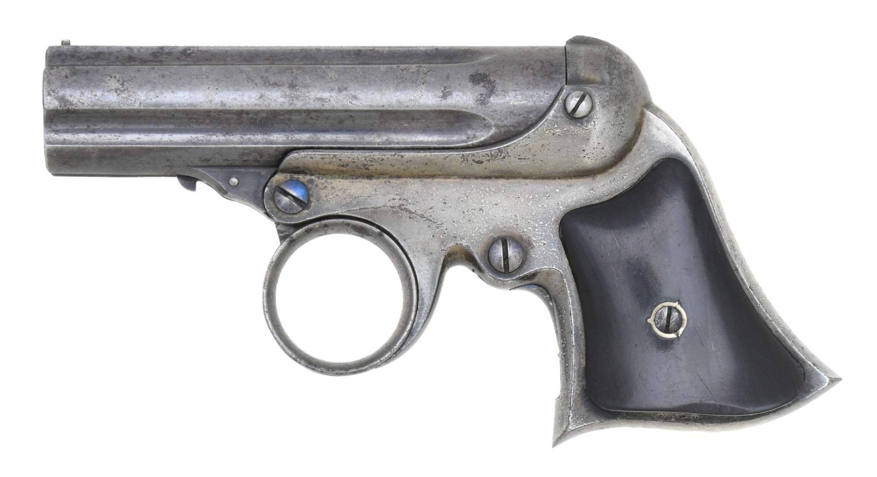 Cal. 22 RF. S# 964. Bbl. 3". Five-shot ring trigger derringer pistol mfg. by Remington. The top of the bbl. is marked with Remington's mfg. information above Elliot's patent information. Frame exhibits a nickel-plated finish, with the bbls. exhibiting a blue finish overall. Frame is mounted with 2-piece smooth wood grips. Bead front sight, with V-notch rear sight. Matching numbers are present on the frame and bbl. CONDITION: frame retains large amounts of its original nickel-plated finish, exhibiting bubbling and flaking overall. Bbls. retain fair amounts of their original blue finish, exhibiting wear and thinning that shows through to gray patina, as well as scattered spots of light to mild surface oxidation and pitting. Bores are bright, exhibiting scattered areas of dark pitting while retaining well-defined rifling throughout. Grips show some superficial marks from handling and storage, with the right grip exhibiting a small chip on the bottom edge of the panel. PROVENANCE: from the collection of a Tennessee gentleman. (01-25700/MLW). ANTIQUE. $800-1,200.