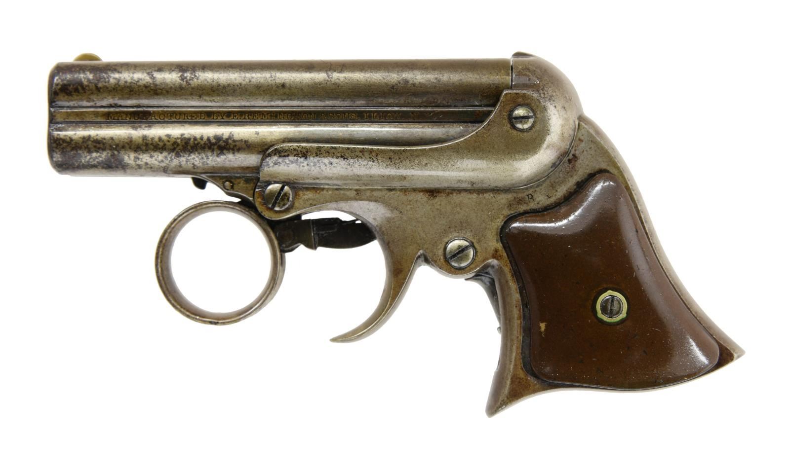 Cal. 32 RF. S# 6999. Bbl. 3 3/8". Fixed half circle blade front sight on tip up 4 Bbl. cluster & simple notch rear sight on frame. Matching S#s on frame & bottom of Bbl. cluster. Brown Gutta Percha grips. CONDITION:. Ring moves & rotates the firing pin but does not "cock" nor "fire". Metal is a dull gray patina under an added coat of varnish w/ cleaned rust staining. Grips show light flaking & chipping. Bores are surprisingly bright, shiny & strongly rifled w/ light scattered spots of pitting. PROVENANCE: From the Lifelong Collection of Glen E. Mattox. (01-22443/CW). ANTIQUE. $400-600.