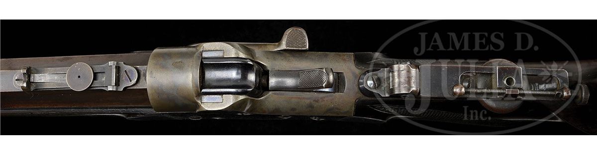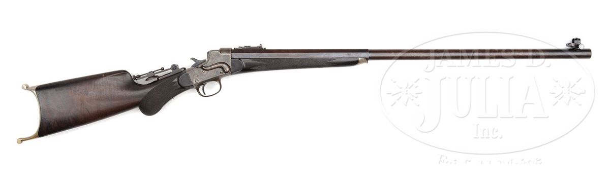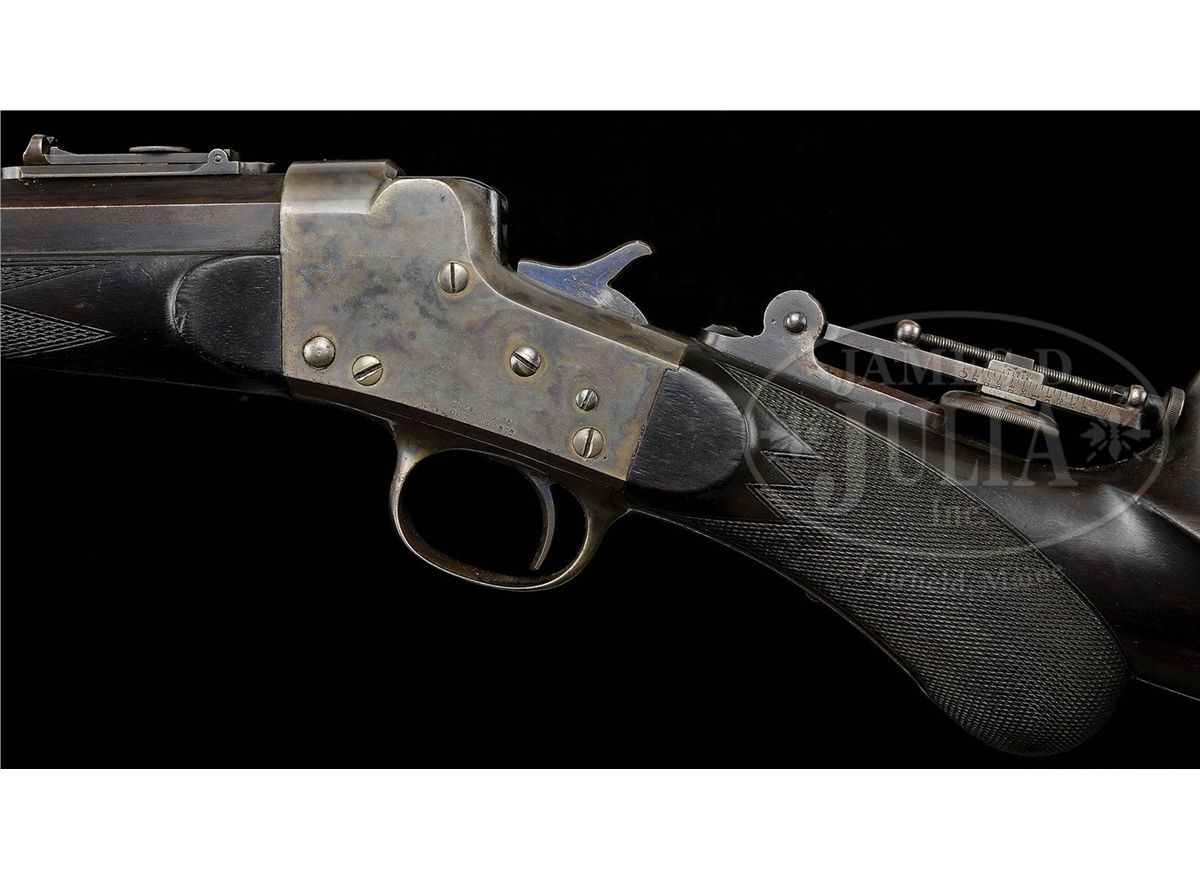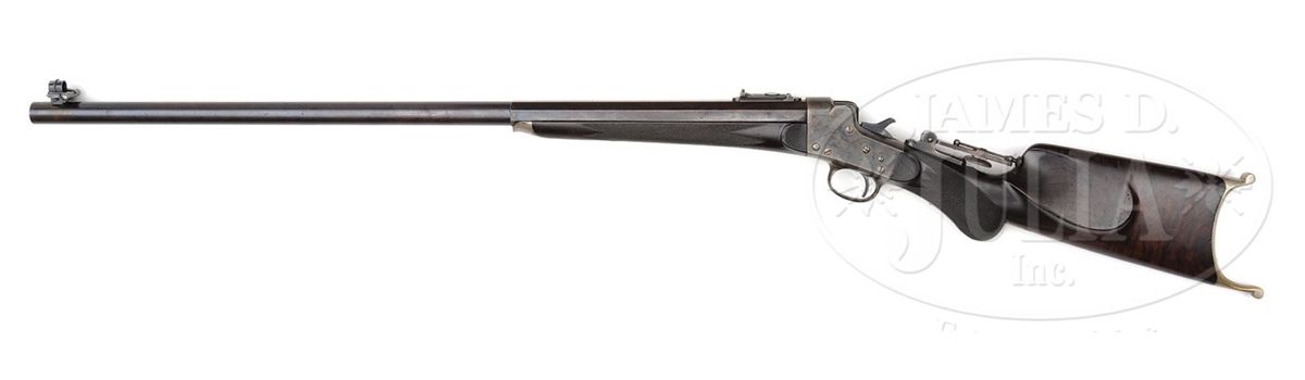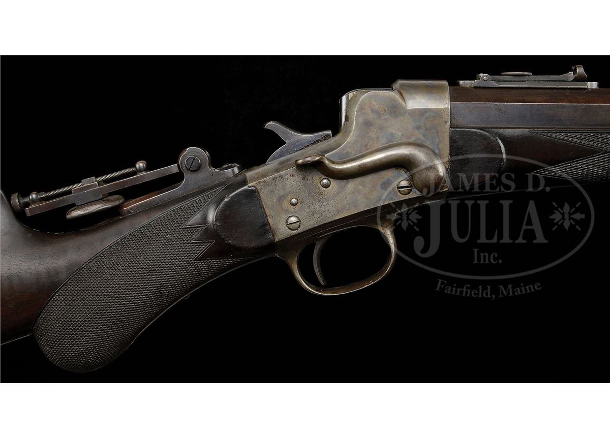 SN 1707. Cal. appears to be 38-40 Remington Hepburn. Fine target rifle with 30" oct to rnd bbl, spirit level windgage front sight, Remington leaf rear sight with sliding peep & thick base vernier tang sight with 3-1/4" staff. Mounted with very nicely figured American walnut with checkered, tapered, rnd forearm that has nickeled steel schnable forearm tip and checkered rnd knob stock with high comb, cheek piece and dainty nickeled brass Swiss buttplate. Accompanied by a notarized letter from Alexandra McCain Morgan, Mrs. Henry Sturgis Morgan, Jr. wherein she states that this firearm was from her husband's collection which she inherited upon his death in 2011. Mr. Morgan was the oldest son of Henry Sturgis Morgan, grandson of J. Pierpont Morgan Jr. and great-grandson of J. Pierpont Morgan, the world renowned financier, railroad tycoon and founder of U.S. Steel and several other well-known companies around the U.S. According to Flayderman's Guide to Antique American Firearms, there were fewer than 1,000 of these rifles produced in the period 1883 to 1907 in 8 different calibers in both "A" and "B" quality. These rifles were among the pace setters of their day and remained in use well into the 20th Century. Rarely are they found today in completely orig configuration with high orig finish. PROVENANCE: Henry S. Morgan Jr. Estate Collection. CONDITION: About fine. Bbl retains 30-40% orig blue with the balance turned to a medium brown patina. Receiver retains virtually all of its orig case colors, moderately faded on the sides and bottom with the trigger guard and lower tang faded to silver. Buttplate retains thin silver finish. Wood is sound with a few light nicks & scratches, shows moderate to heavy wear on the checkering and retains a dark handrubbed oil finish. Mechanics are fine. Bright, shiny bore. 4-49130 JR272